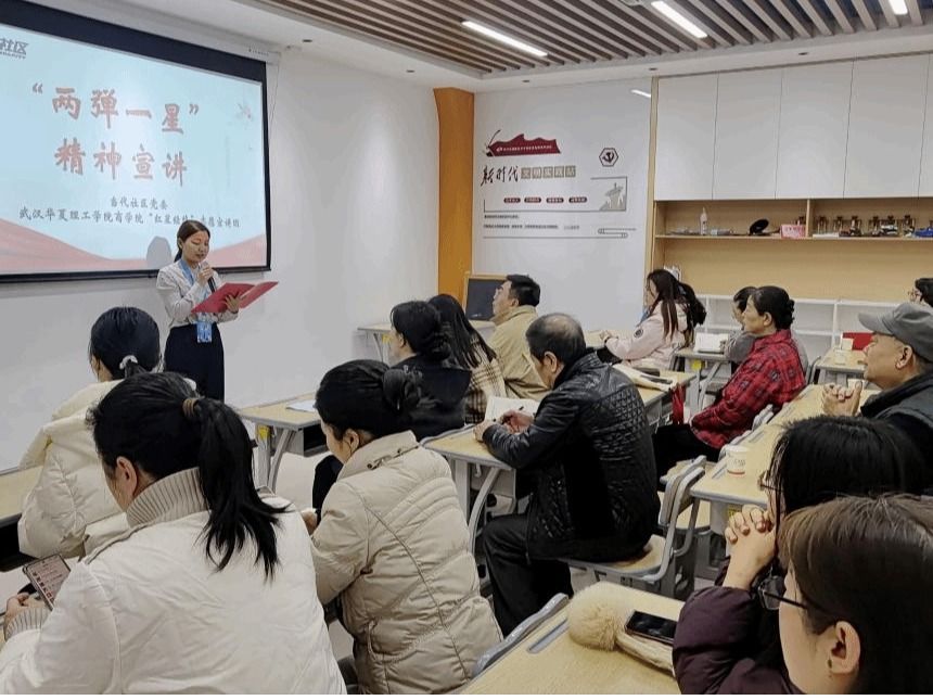 当代社区党务负责人带领大家学习近期重要文件精神后,就进入主题宣讲环节。宣讲团成员张宇领唱《强军战歌》,社区居民与成员齐声高歌,歌声里满是对家国的赤诚与热爱;随后一段《难忘的激情岁月》视频,将众人思绪拉回上世纪五六十年代的戈壁滩,黑白影像里的科研场景,让听众直观触摸到“两弹一星”事业的艰辛与壮阔。
