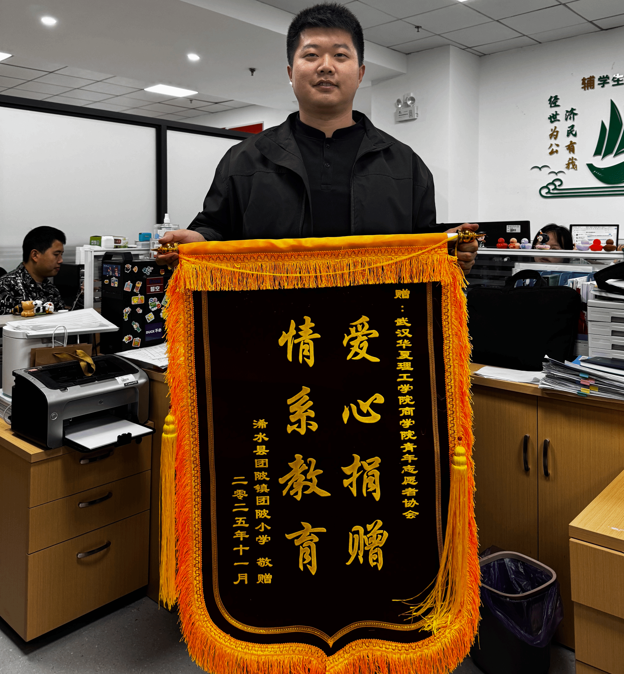 青春不以山海为远,志愿只向国家未来。11月3日,商学院青年志愿者协会收到了一份来自黄冈市浠水县团陂镇团陂小学的珍贵礼物——“爱心捐赠,情系教育”锦旗。这面锦旗,不仅是对“希望树”爱心志愿活动最温暖的肯定,更见证了跨越山海的爱心传递,彰显了当代青年服务社会、奉献担当的精神风貌,凝聚了志愿者们真挚的关怀与切实的行动。
