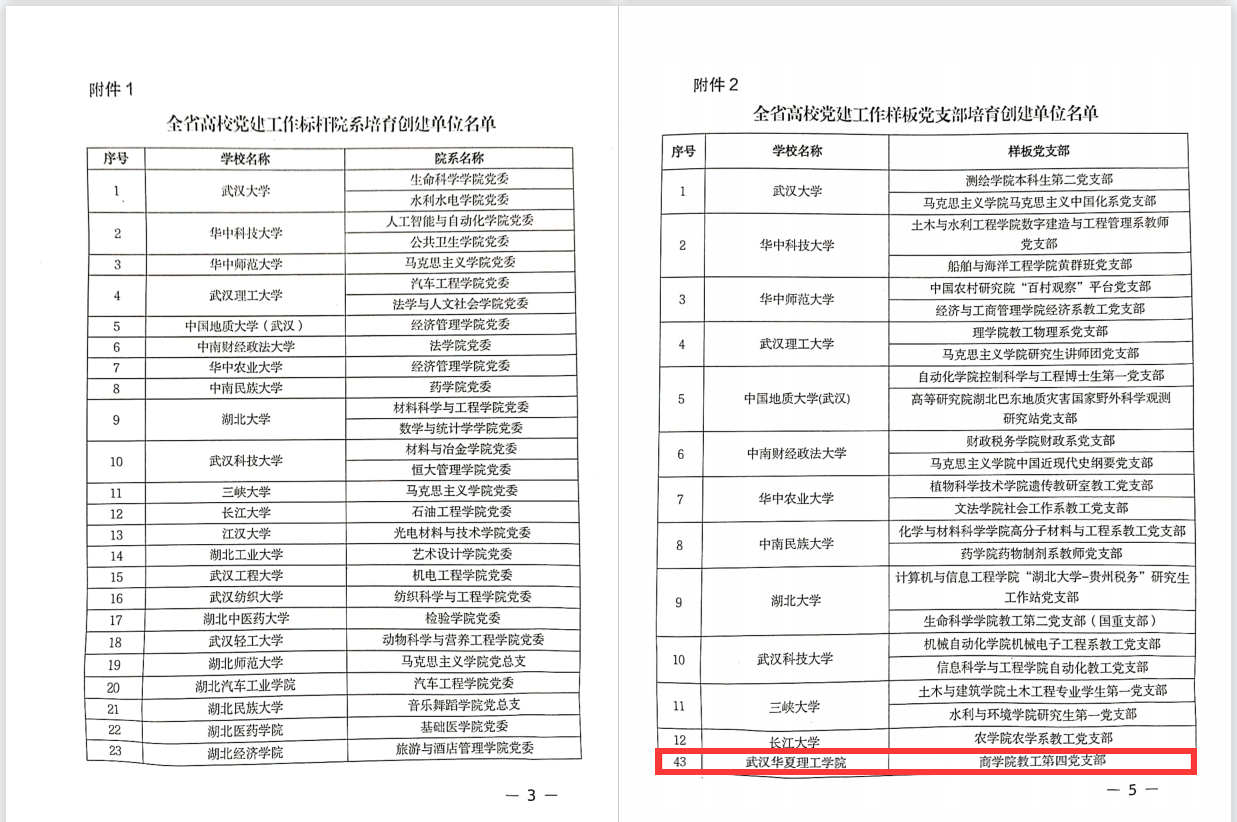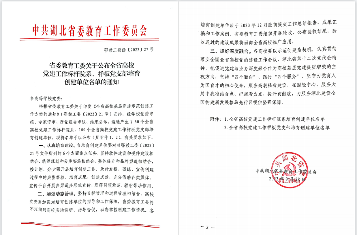 日前,中共湖北省委教育工委公布了全省高校党建工作“标杆院系”“样板支部”培育创建单位名单,我院教工第四党支部获批“全省高校党建工作样板支部”培育创建单位。