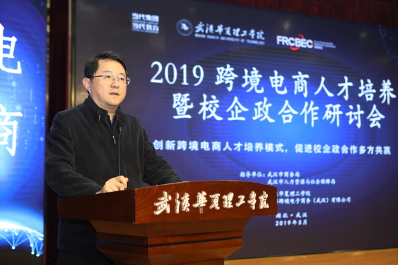 2019年3月29日下午,2019跨境电商人才培养暨校企政合作研讨会在beat365学术报告厅隆重举行。武汉市商务局局长韩民春、武汉市人力资源和社会保障局人才中心副主任李昭、弗睿跨境电子商务武汉有限公司总经理张建波,学校校领导,商学院、外国语学院院长及相关单位负责人出席。武汉商学院、武汉东湖学院、武昌首义学院、文华学院等16所兄弟院校代表受邀参加会议。