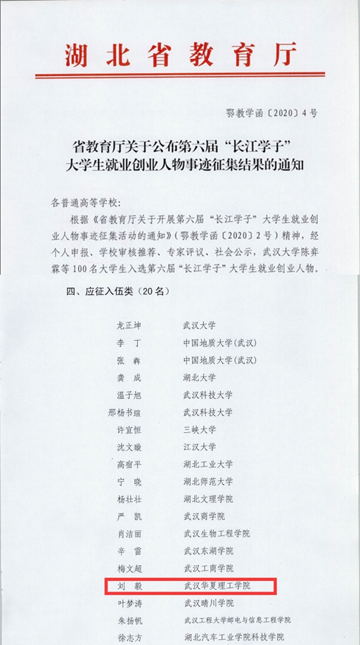 我院2020届毕业生刘毅荣获第六届“长江学子”称号