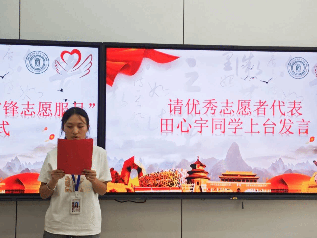 团支部颁奖结束后,杨斗老师宣读优秀志愿者名单,并为志愿者代表颁发奖状。优秀志愿者代表田心宇上台发言分享了参与志愿服务的收获心得,号召更多同学积极投身志愿服务,让雷锋精神在奉献中传承发扬。至此,活动正式结束。