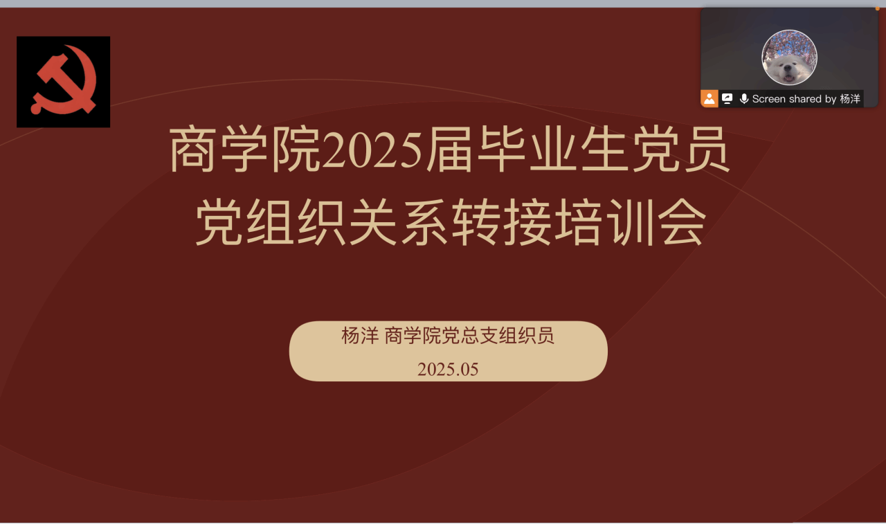 5月19日晚,2025届毕业生党员工作会议通过腾讯会议线上举行。此次会议围绕党员档案与党组织的关系、党员组织关系转接的政策依据和手续,以及已就业党员带动未就业同学等重要内容展开,旨在帮助毕业生党员明晰相关要求,做好毕业离校相关工作。商学院党总支副书记孙文胜、学工办主任刘浩波,各支部书记,毕业班辅导员及全体毕业生党员参会。会议由党总支组织员杨洋主持。