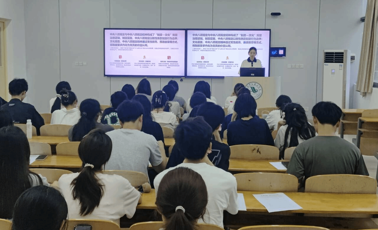 活动讲述了中央八项规定精神的理论逻辑与实践意义,指出其构建了“制度—文化”双层治理逻辑,实现了“依规治党”与“以德治党”的结合。在实践层面,中央八项规定精神是新时代党的建设的基础性工程,对于维护党中央权威、密切党同人民群众联系、遏制腐败滋生具有重要意义。她要求学生党员提高政治站位,从政治高度把握作风建设的重大意义,警惕“指尖形式主义”等新变种,主动适应新时代要求,践行青年党员的使命担当。