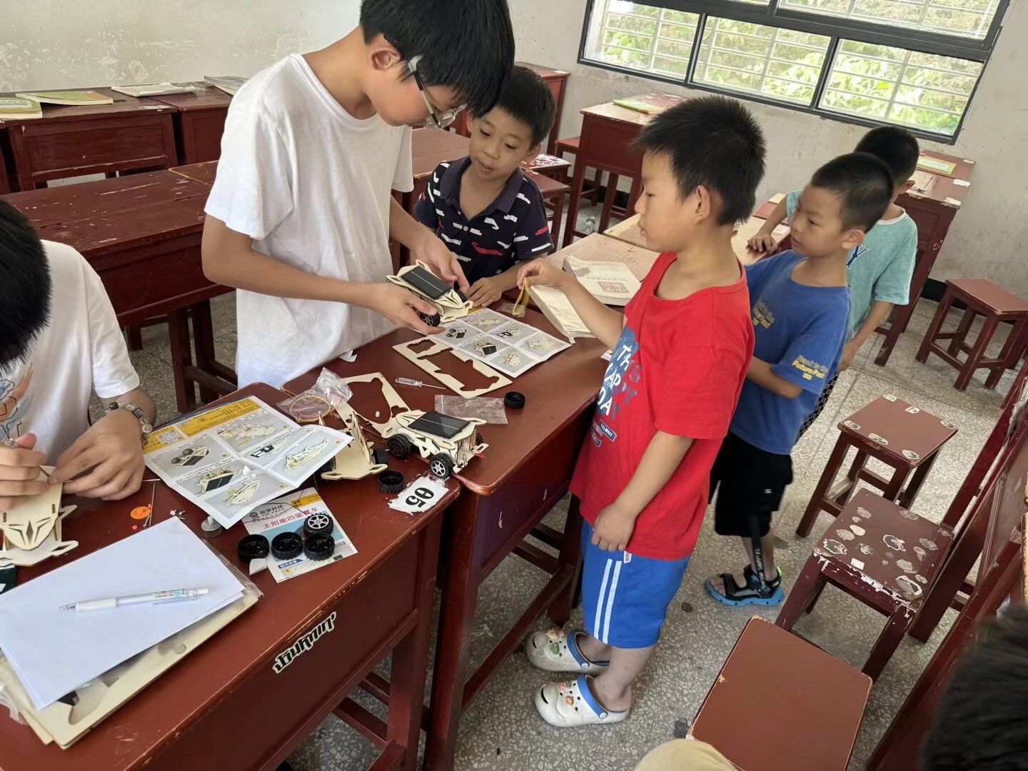 上午的课堂上,实践队成员们带领孩子们动手组装太阳能直升飞机。相较于前一天的电动小车,直升飞机的组装涉及更多部件配合与结构认知,孩子们却丝毫没有畏难——有的专注研究说明书,有的互相讨论零件安装顺序,还有的主动向老师请教组装技巧。在大家的共同努力下,一架架带着螺旋桨的小飞机逐渐成型。当孩子们捧着自己的作品来到户外,阳光照射在太阳能板上,螺旋桨缓缓转动、机身微微腾空时,欢呼与惊叹声此起彼伏。这场实践不仅让孩子们进一步了解太阳能的应用原理,更在动手过程中培养了空间思维与团队协作能力,让“科技改变生活”的种子在心中悄然发芽。