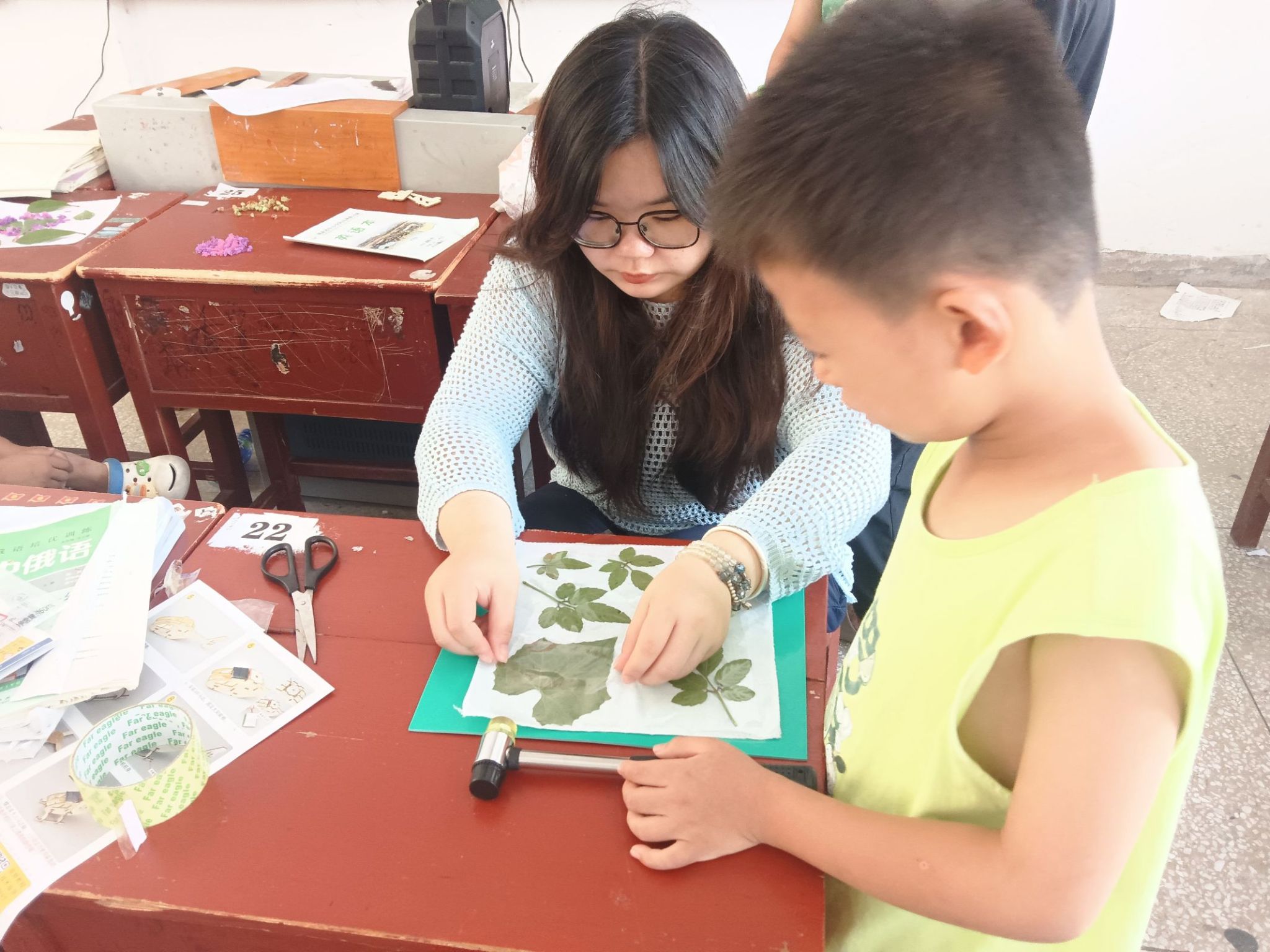 上午,实践队副队长王梦雪为孩子们开展了植物拓染特色主题课程。在老师的引导下,孩子们有序选取心仪的树叶和花粘贴在绢布上,再通过轻轻捶打让植物的色彩自然晕染在绢布上,展现自然的色彩。孩子们全程积极投入,亲手创造出一份又一份独特的作品。看着孩子们脸上洋溢的灿烂笑容,实践队员们的心中也充满了满满的收获感。下午,实践队根据不同年龄段孩子的需求精心设计了课程。针对低年级孩子,队员们准备了生动有趣的英语预习课,通过互动游戏和情景模拟让孩子们提前接触英语,在轻松的氛围中培养语感,激发对英语学习的兴趣。对于高年级的孩子,实践队开设了物理小课堂,考虑到他们下学期即将接触物理课程,队员们以模块化的方式系统讲解基础物理学知识,用生活化的案例化解抽象概念,帮助孩子们打消对物理学科的畏难情绪和疑虑。课程的最后,所有孩子齐聚一堂上了一堂温馨的音乐课。实践队成员先通过电子琴带领孩子们感受音律的魅力,随后教唱李叔同经典歌曲《送别》。