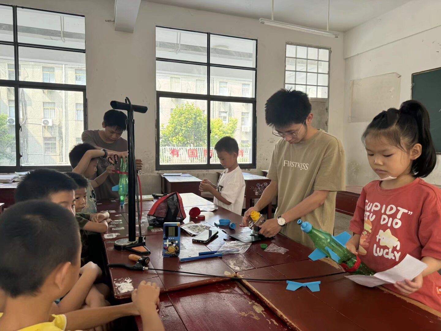 上午的科学实践课上,队长涂淦招带领孩子们挑战组装水火箭。从认识瓶身、喷嘴、尾翼等部件,到学习水与气压的作用原理,再到一步步完成拼接、固定,孩子们全程专注投入。有的小组为尾翼角度争论不休,有的围着老师反复确认注水比例,还有的提前模拟“发射倒计时”过足瘾。当一个个色彩各异的水火箭立在操场中央,孩子们举着自己的作品紧张又期待。随着涂淦招一声“发射”,高压下的水从喷嘴喷出,火箭带着呼啸声直冲蓝天,最高的竟飞到近20米高,落地时引发全场欢呼。这场实践不仅让孩子们直观感受物理原理的魅力,更在动手与合作中种下“探索未知”的种子。午后的课堂则充满了历史的厚重与精神的洗礼。实践队成员包慧颖带来的历史课,以“尧舜禹的故事”为主题,用动画短片、情景问答串联起“尧帝让贤”“大禹治水”等经典片段。当讲到大禹“三过家门而不入”时,孩子们瞪大眼睛追问“他不想家吗”;说到尧舜禅让的故事,有人举手提问“什么是‘贤德’”。包慧颖用孩子能听懂的语言解释:“就像你们分享玩具、帮助同学,也是一种小‘贤德’呀。”课堂在故事与互动中变得鲜活,孩子们不仅记住了历史典故,更在心中埋下“向善向贤”的种子。