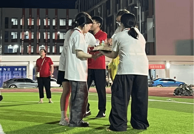 演奏环节后,活动转入“萌新生日会”环节:舞台大屏切换主题画面,餐车推送生日蛋糕入场,在场师生自发起身,齐唱生日歌,简洁真挚的旋律在操场回荡,传递出校园对新生的关怀与期许。佩戴生日皇冠的新生,在工作人员与老师的引导下参与分切蛋糕,其余新生有序领取,现场秩序井然,充分体现出集体活动的协作与温情。