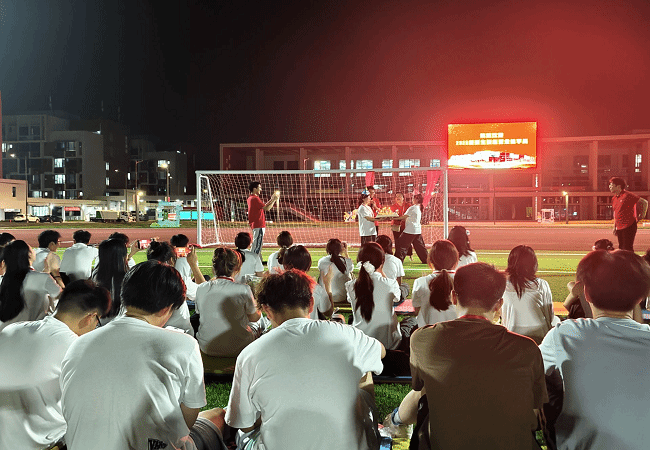 夜幕降临,校园操场被暖黄色灯串点亮,氛围温馨而庄重。活动以返校校友乐队的校园曲目演奏开场,经典旋律,既保留了校园文化的熟悉感,也传递出新生入学的新气息。现场新生有序围坐,在旋律中逐步适应新环境,初步建立起集体参与的氛围。