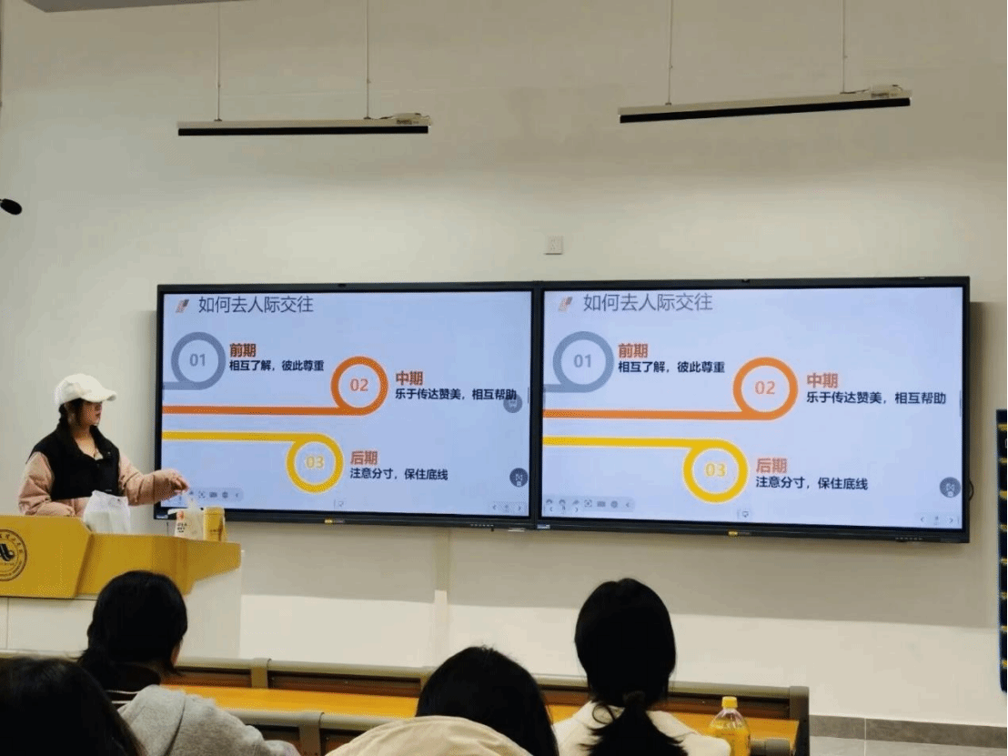 在人际交往环节,主讲人细致梳理了人际交往所涵盖的范围,包括同学日常互动、师生高效沟通、集体活动参与等多个层面,并结合实际场景分享了实用的交往技巧,如积极倾听、换位思考、清晰表达等,助力心理委员更好地引导同学们建立和谐的人际关系,营造温暖融洽的班级氛围。