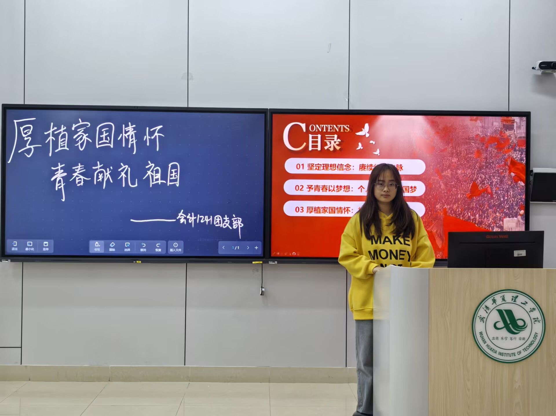活动伊始,团支书黄雅婧带领团员重温入团誓词,铿锵誓言回荡现场,进一步坚定团员听党话、跟党走的信念。随后,通过播放爱国主义主题短片,回顾祖国发展历程中的辉煌成就,从科技突破到民生改善,直观展现祖国日新月异的变化,激发团员民族自豪感与责任感。