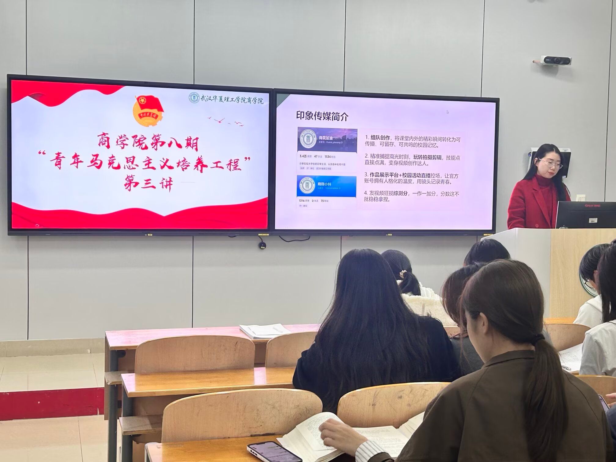 2025年11月26日晚18:30,青年马克思主义者培养工程培训班第三讲在2教209教室开讲。本次讲座以“传媒力量与青年担当”为主题,由印象传媒指导老师谢李淼主讲,为青马学员带来一场关于新媒体时代青年责任与使命的深度对话。