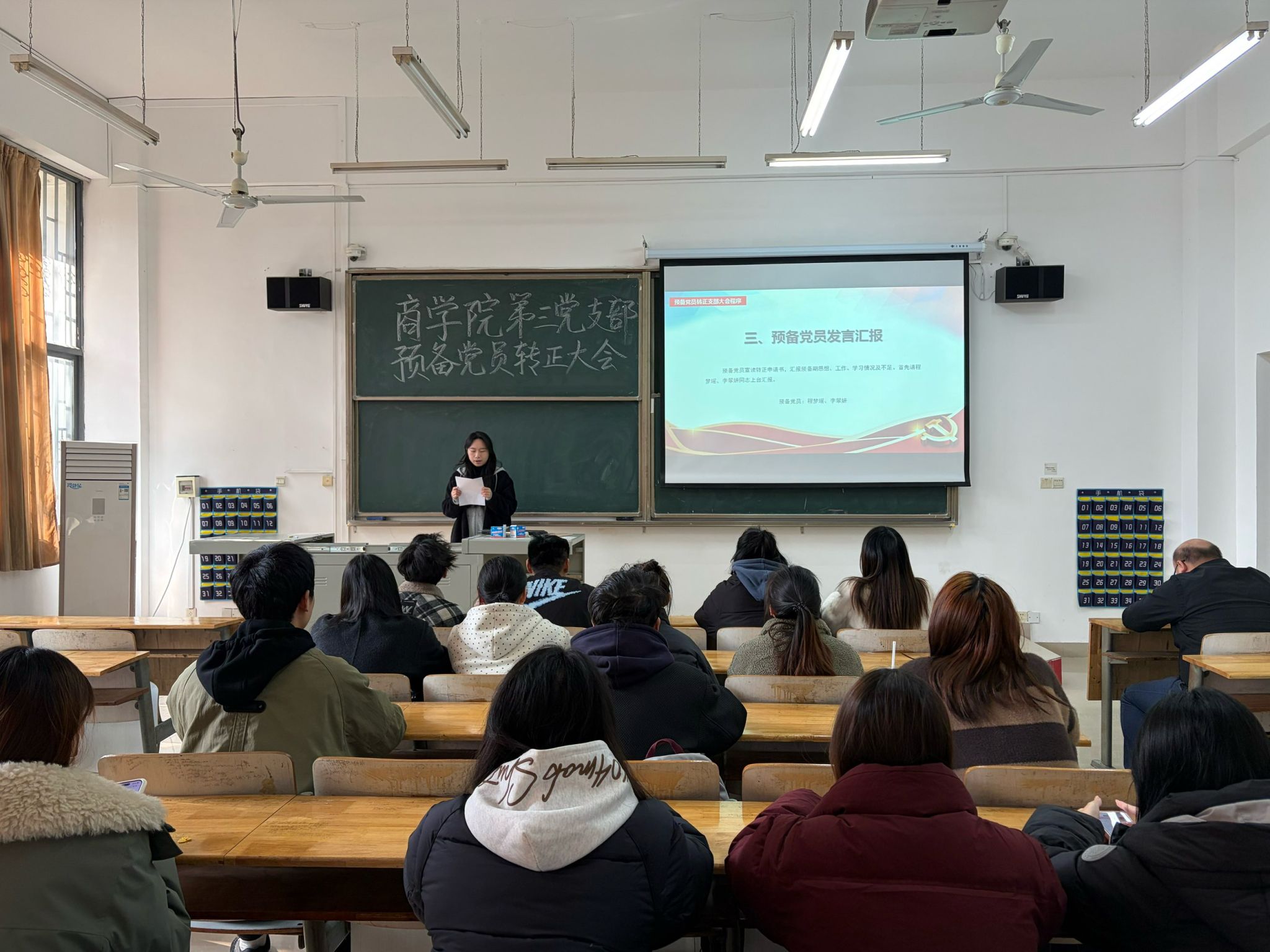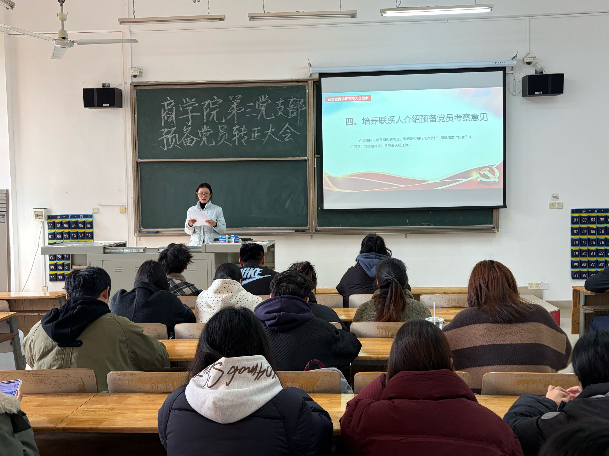 为进一步夯实党组织建设根基,锤炼党员党性修养,充分激发党员干部先锋模范带头作用,商学院学生第三党支部于2025年12月16日在3教110召开了预备党员转正大会,会议由党支部书记倪沙同志主持。