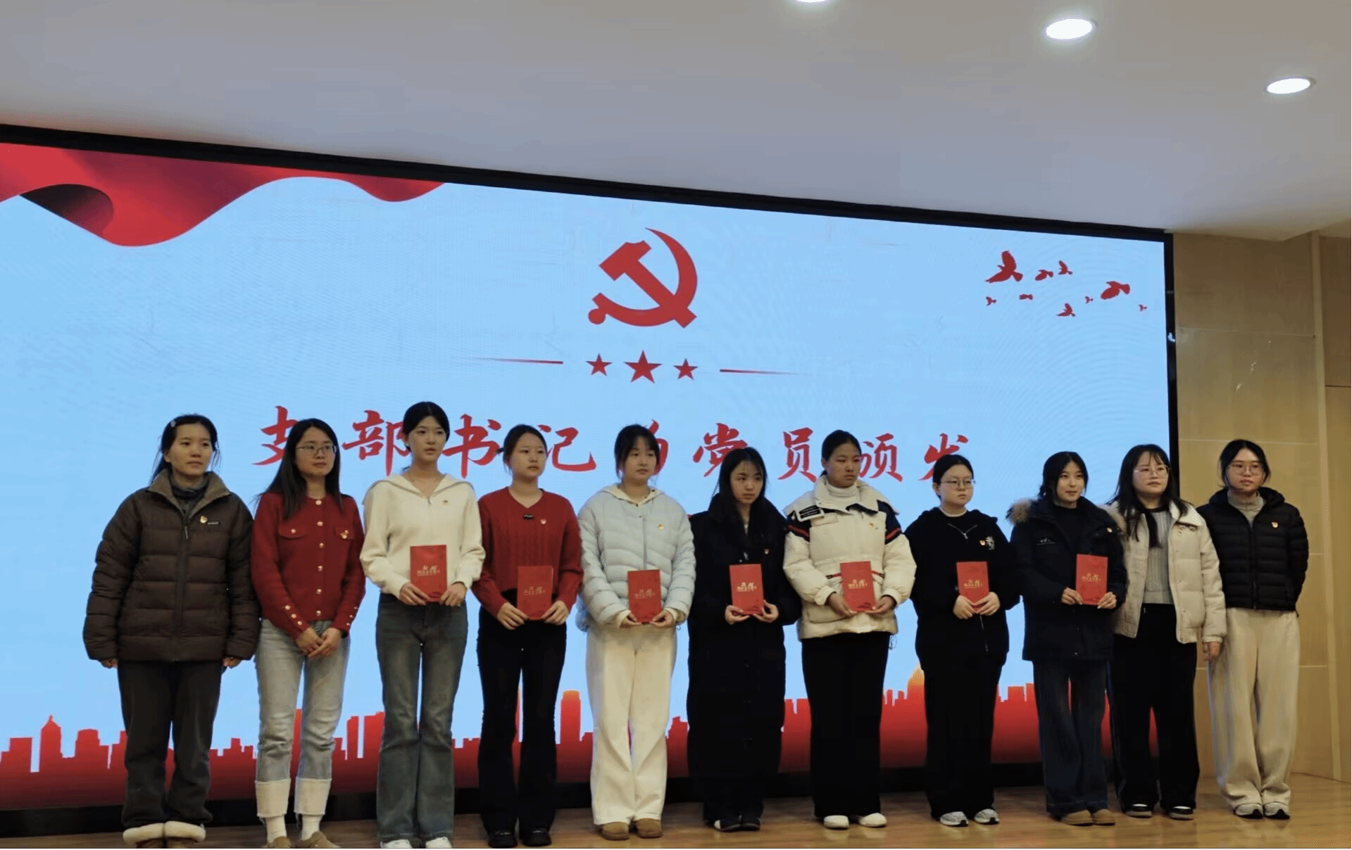 支部书记们为周雨凡、吴可轩等7名党员代表郑重颁发政治生日贺卡,贺卡上的殷切寄语让党员们感受到了党组织的温暖与关怀。仪式感满满的党徽佩戴环节中,吴雨豪、李茗悦等8名正式党员为16名新发展党员代表佩戴党徽、颁发纪念品,一枚枚熠熠生辉的党徽,象征着责任与传承,标志着新党员正式加入党组织大家庭。新发展党员代表平启劼发言,表达了对党组织培养的感恩之情,承诺将以老党员为榜样,严守党的纪律,锤炼过硬本领,争做合格共产党员。