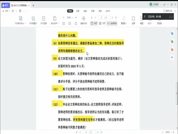 5月11日晚上20:00,财会系吴小娟老师组织会计1211班同学在线上召开了毕业论文答辩注意事项的主题班会,本次班会旨在为即将毕业的会计1211班学生提供职业规划建议、毕业论文答辩注意事项以及毕业寄语,帮助他们顺利通过毕业论文答辩,平稳过渡到职场生活。