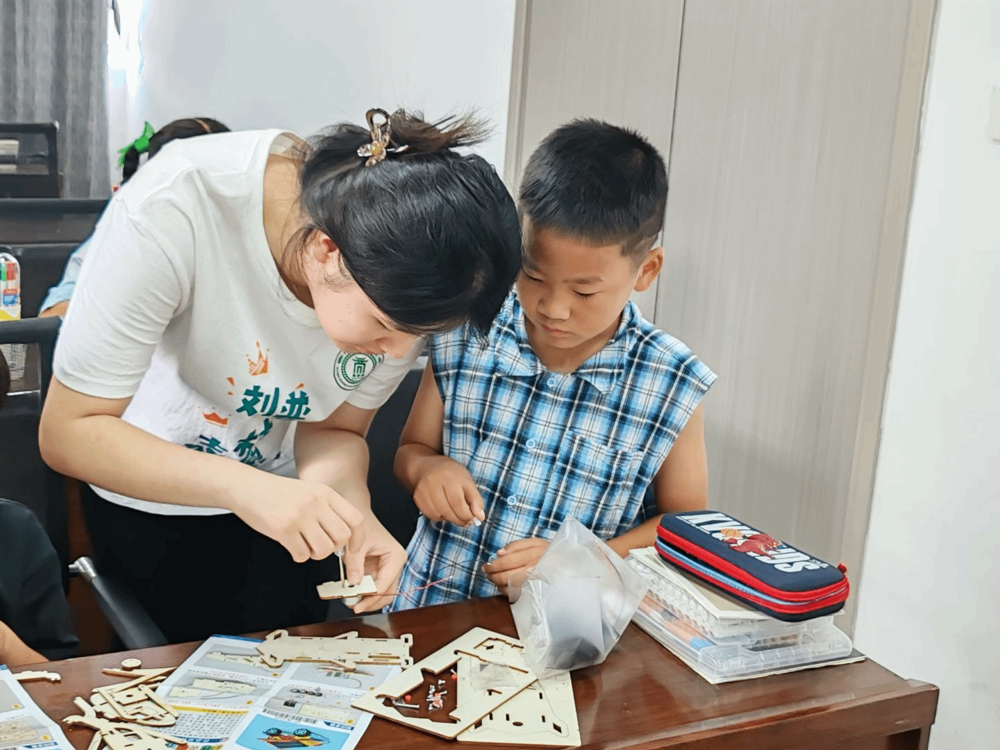 课程伊始,实践队队员化身科学老师,用接地气的提问拉开序幕:“夏天晒太阳会觉得热,太阳能还能做什么?” 瞬间点燃孩子们好奇。紧接实践队员们为孩子们展示太阳板飞机和汽车模型成品,现场氛围浓厚,孩子们迫不及待想揭开“晒太阳就动”的秘密。在知识讲解环节,队员们把太阳板比作“光能小管家”,通俗解释“太阳光变电能,驱动模型跑”的原理,又拆开模型,教孩子们认太阳板飞机的“身子骨”,讲汽车拼图咋“搭积木”,让知识变得看得见、摸得着。在实践队员们对太阳能的基本原理和模型进行了简单的介绍后,孩子们开始进行动手实践,有的仔细对零件、有的照着图纸研究步骤,队员们来回指导,帮助孩子们在实践过程中所遇到的问题与提出的疑问。在孩子们拼接完模型后,队员们鼓励孩子们进行作品对自我展示与分享,激发了孩子们对科学探究的好奇心与热情,凭借趣味模型操作,点燃学生对科学课程、科技实践的兴趣,促使学生主动探索生活里的科学奥秘;通过太阳能应用实践,传递环保、节能理念,培育学生绿色能源认知与可持续发展观念,塑造科学素养与社会责任感。