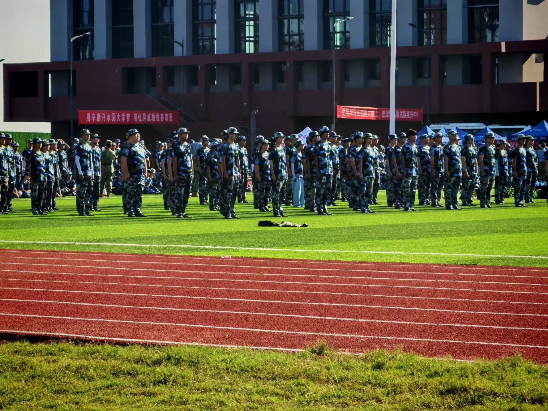 夕阳西下,余晖为训练场上的迷彩服镀上一层温暖的金边。新生们的脸庞虽带着些许疲惫,却难掩收获的喜悦与成长的坚定。他们用汗水浇灌青春梦想,用坚持铸就钢铁军魂,在军训的热血篇章中书写着属于自己的成长故事,也为即将开启的大学生活奏响了铿锵有力的序曲。