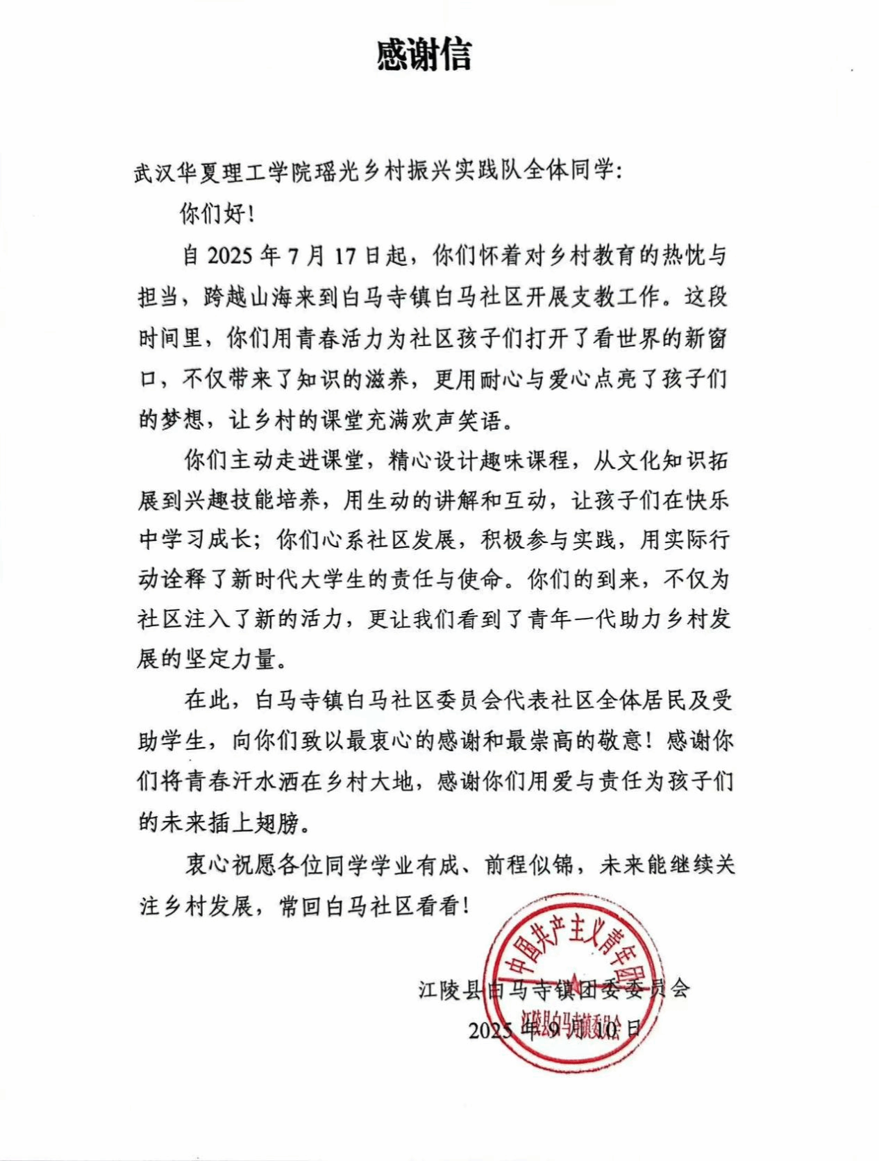 传递扎根乡村的热忱与温暖,凝聚乡村振兴的磅礴合力,beat365官方网站商学院瑶光乡村振兴实践队首先向所有关心、支持瑶光乡村振兴计划的老师同学以及社会各界,致以衷心感谢与崇高敬意!在这份谢意的背后,承载着一份特殊的肯定—2025年9月,瑶光乡村振兴实践队收到了来自湖北省荆州市江陵县白马寺镇白马社区委员会的感谢信,这份沉甸甸的认可,不仅是对实践队全体成员扎根乡村、践行使命的莫大鼓舞,更是对青年学予以青春之力赋能乡村振兴事业的有力肯定。