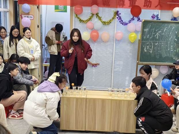 除了精彩的文艺表演,在晚会中还有师生互动小游戏,这增加了活动的趣味性,也增进了师生间的亲密感。最后元旦游园会在杨峰博老师对新一年的祝福里,全体师生合影留念,为此次的晚会画上圆满的句号。
