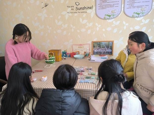接着,她向大家演示如何制作手链。讲解要点,回答她们提出的问题。当一条美丽的手链在她手中成形时,大家全神贯注,在她宣布可以自主创作时,所有人专注地挑选着自己需要的珠子,仔细地编织着线绳,还会讨论如何搭配颜色使手链更加美观。