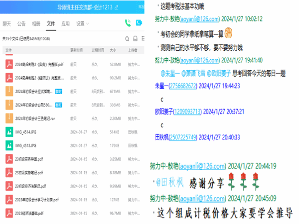 在2024年1月15日,敖艳老师让学委统计了该班初级会计师证书通过率,情况很不理想,反馈说只有2个人通过。之后,敖艳老师在QQ群里进行了报考的提醒和动员工作,并上传了考证指定的电子版教材和以及备考学习计划表。在学生寒假期间,从2024年1月25日到2024年2月3日敖艳老师在QQ群里引导大家进行每日一题的复习和分享,督促大家开展复习备考工作。