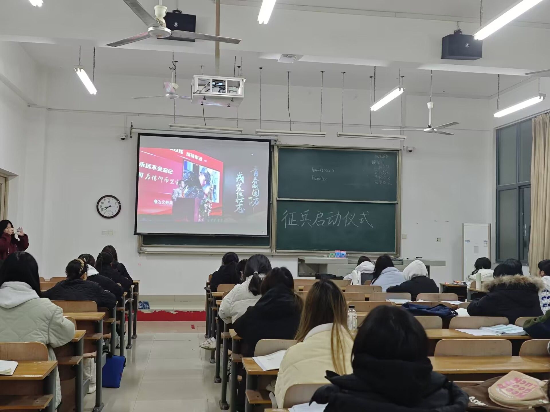 为了弘扬爱国精神,助力国防建设,传承红色基因。商学院组织全体大一新生于12月18日晚19时30分在教室观看由武装部举行的2025年征兵启动仪式在线直播。