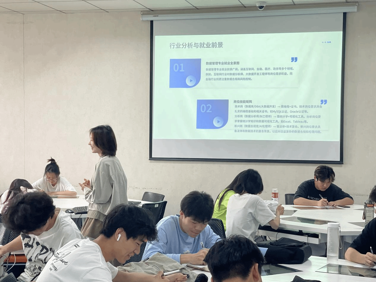 在班会的第三阶段,陶老师给我们详细介绍了数据管理专业可以从事的行业分析,以及未来的就业前景。如今,我们身处大数据时代,大数据管理与应用专业无疑有着广阔的发展空间和良好的就业前景。首先,各行业对数据相关需求不断增长,互联网、传统制造、金融等行业都需该专业人才。其次,相关就业数据显示,数据分析专业的毕业生供不应求,薪资可观,且随着技术迭代,对专业人才需求还将攀升。想要抓住机遇,这就要求同学们在校期间,扎实学好专业课程,紧跟行业发展趋势,积极参与实践项目,不断提升自己的专业技能,以便在毕业后能够顺利投身于这个充满机遇的领域,在大数据的浪潮中展现自己的才华,为社会发展贡献力量。