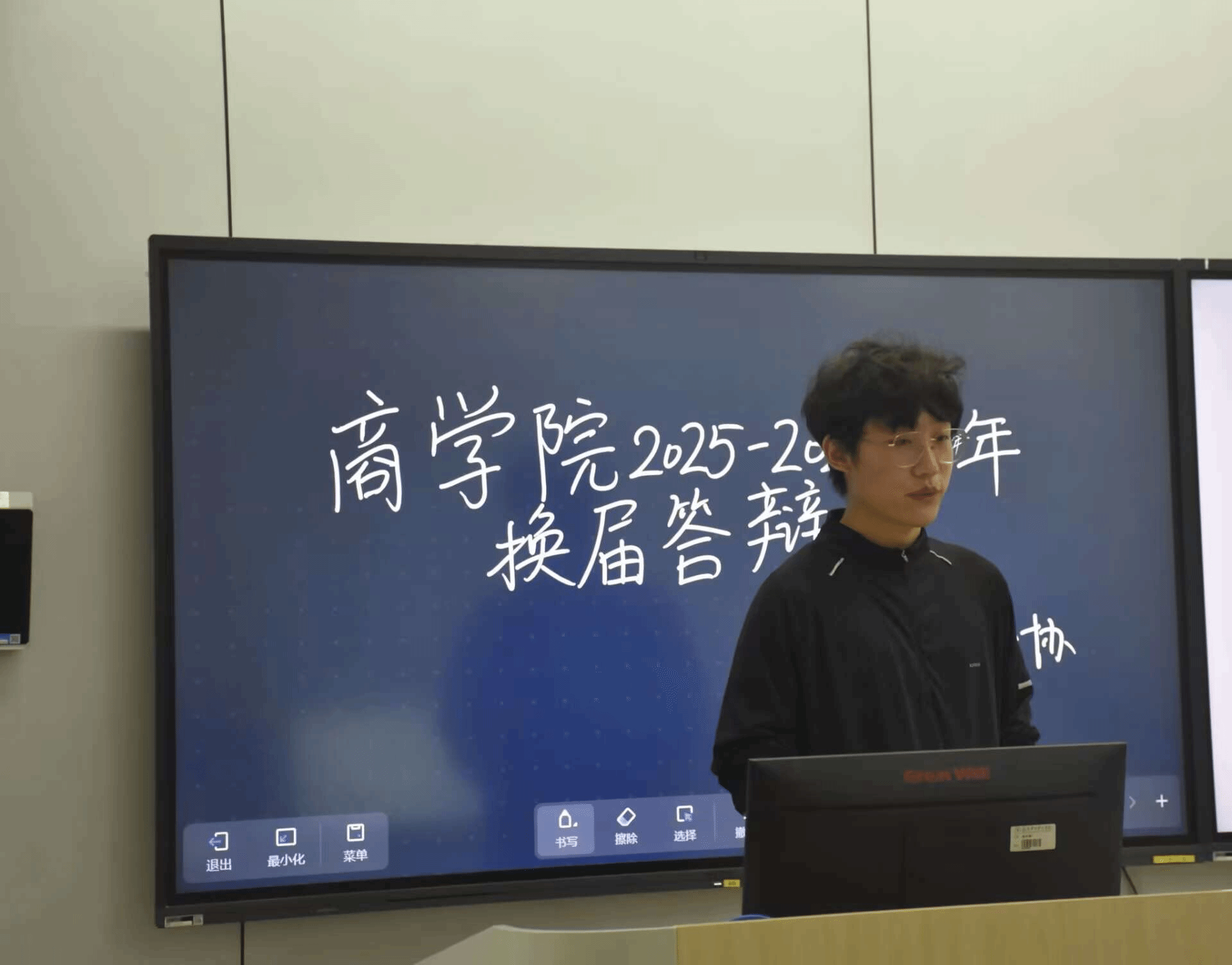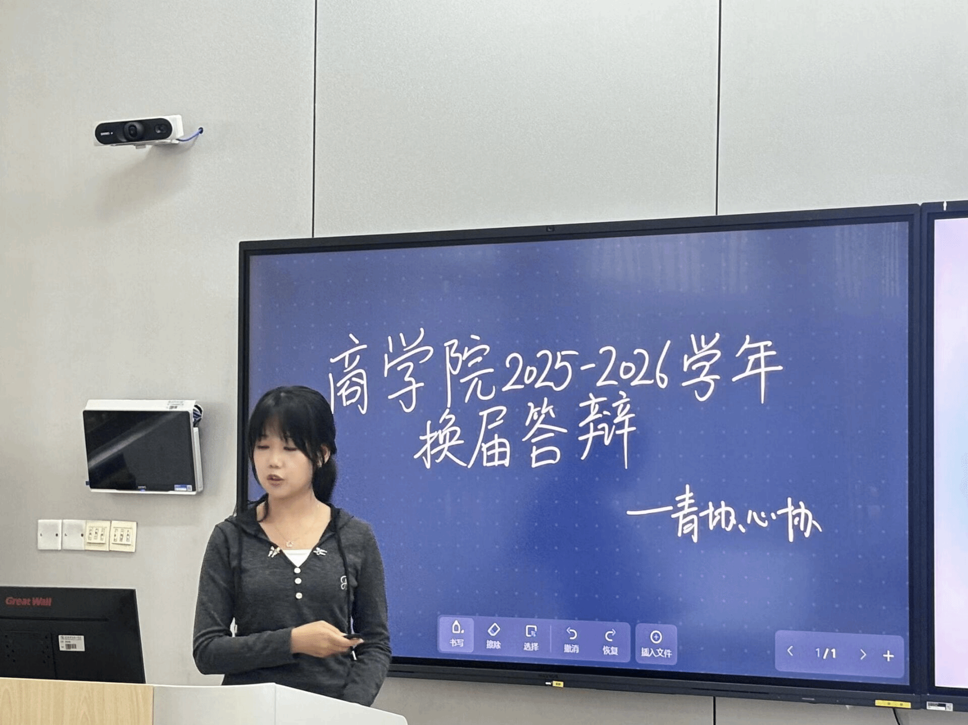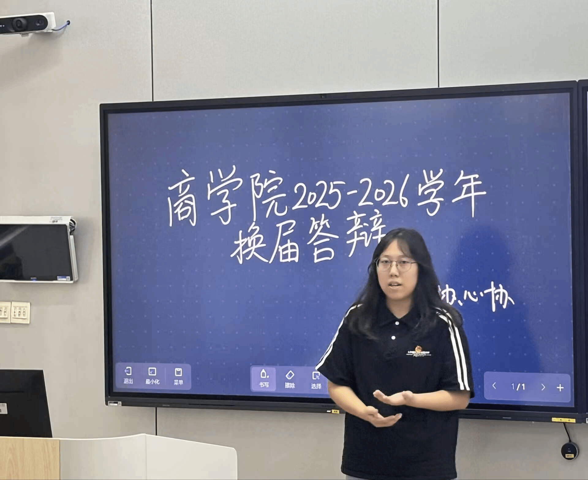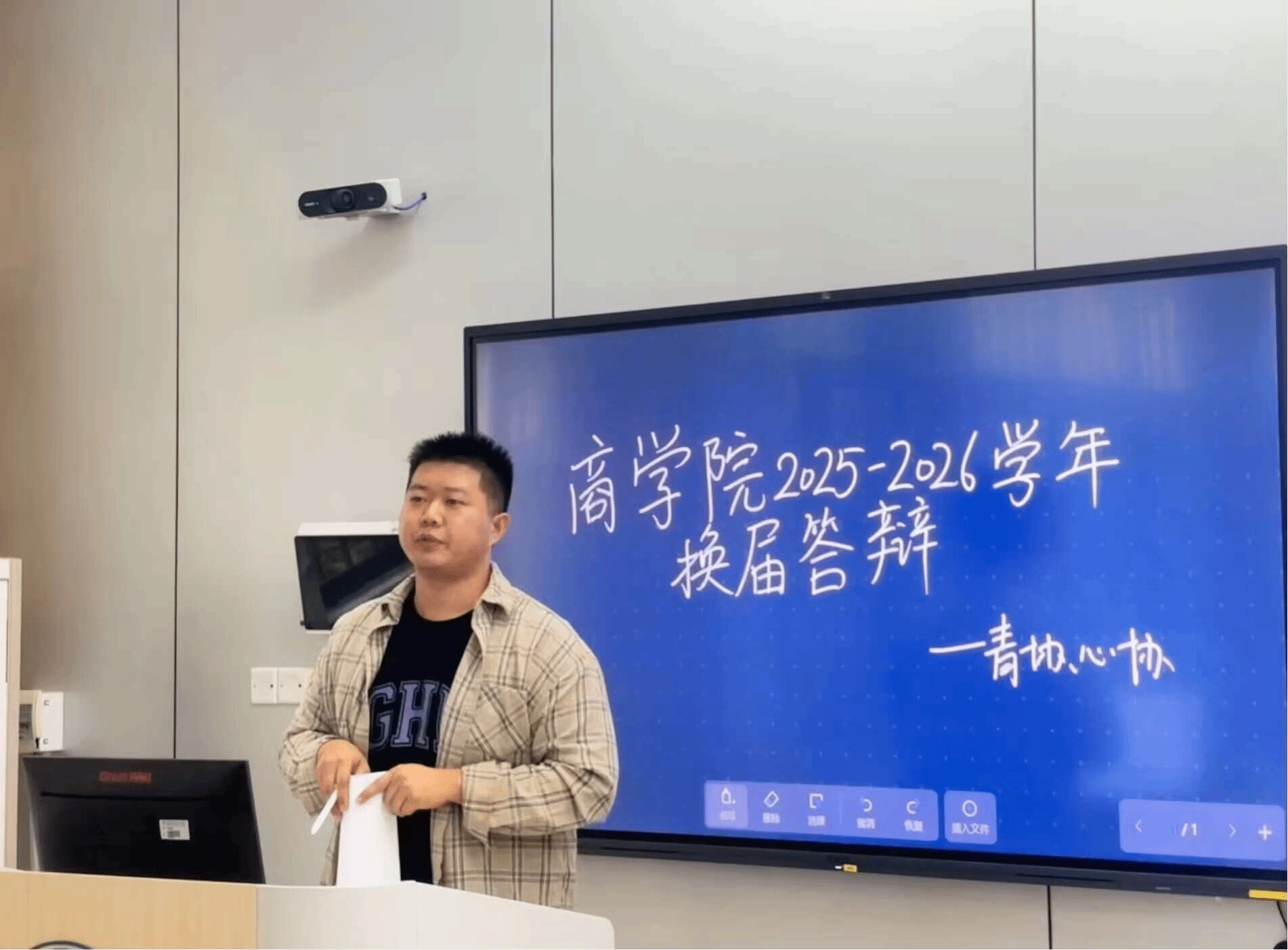 主持人以沉稳且富有感染力的语调,向全场介绍莅临本次大会的评委张文昌老师,同学们热烈的掌声在会场内回荡,在竞选者的ppt答辩环节中,每位同学都以饱满的热情与深刻的思考,勾勒出未来协会发展的清晰蓝图。在协会内部建设方面,有竞选者提出构建同步完善阶梯式培训体系,旨在通过精准化培养,全面提升志愿者服务的专业化水平;更有竞选者敏锐捕捉时代脉搏,围绕校园环保热点,提出以创新形式为校园生态文明建设注入新活力。值得一提的是,竞选者们不仅立足未来,对过往所举行的活动中暴露出的短板也进行了深入剖析,并针对性地提出优化流程、整合资源等一系列可落地的解决方案。答辩环节结束后,评委席的老师与往届主席团成员紧扣实践痛点,就“学业与协会工作的平衡策略”“提升活动参与率的创新方案”“当选后增强团队凝聚力的具体举措”等关键议题展开提问。候选人们从容应答,结合过往经历与深度思考,以清晰的逻辑架构和务实的解决方案,充分彰显出扎实的应变素养与强烈的责任意识。