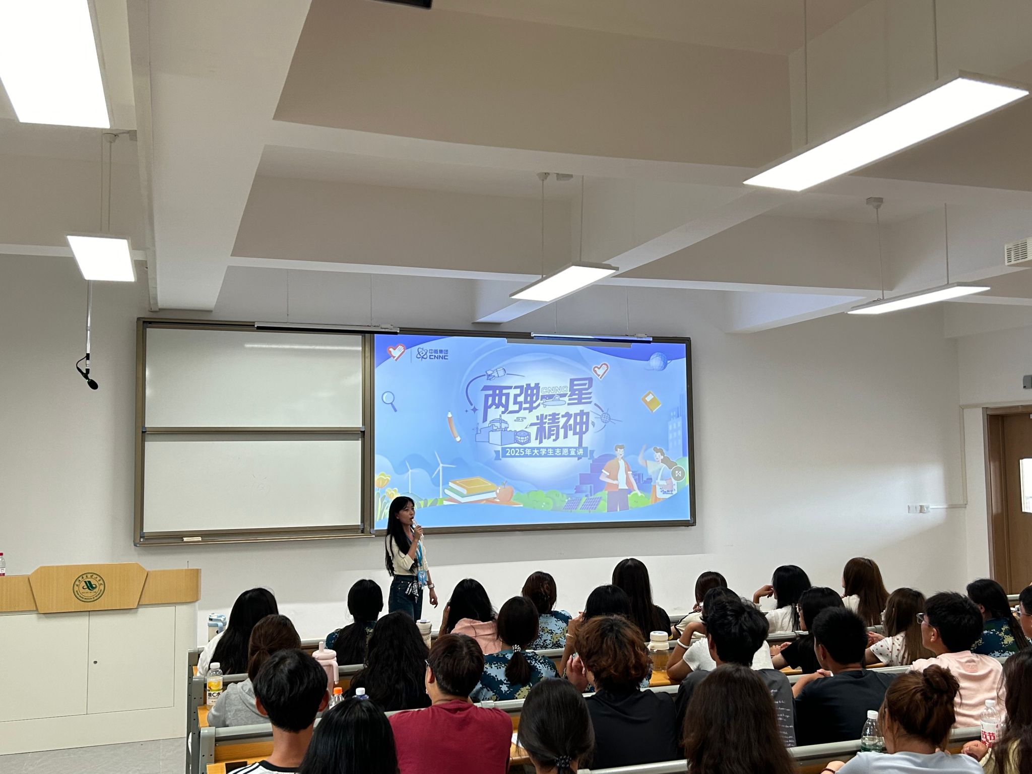 为弘扬“两弹一星”精神,将红色教育深度融入新生入学教育,引导2025级新生厚植家国情怀、勇担时代使命,9月28日下午2点,商学院党员服务站“红星经纬”志愿宣讲团于梧桐湖校区C317教室,为国贸、经融专业新生带来“两弹一星”精神主题宣讲,本次宣讲由周雨凡同志主讲。