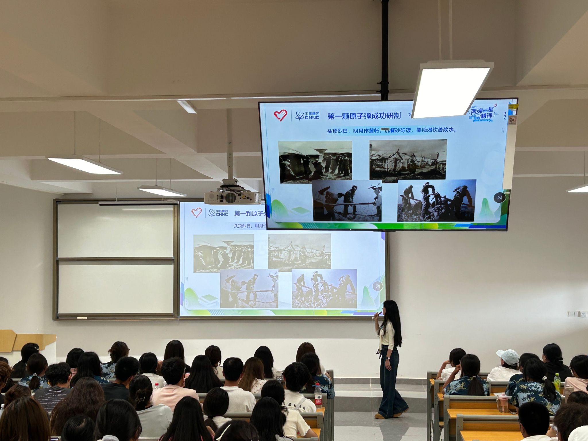 宣讲现场,周雨凡同志以“两弹一星”精神的核心内涵为切入点,结合珍贵历史资料与感人故事,带领新生回溯我国第一颗原子弹成功研制的艰辛历程:从戈壁荒原的默默攻关,到科研工作者突破技术封锁、克服物资匮乏等重重困难,最终实现国防科技重大突破的奋斗史诗,让新生直观触摸到“热爱祖国、无私奉献”的精神底色。