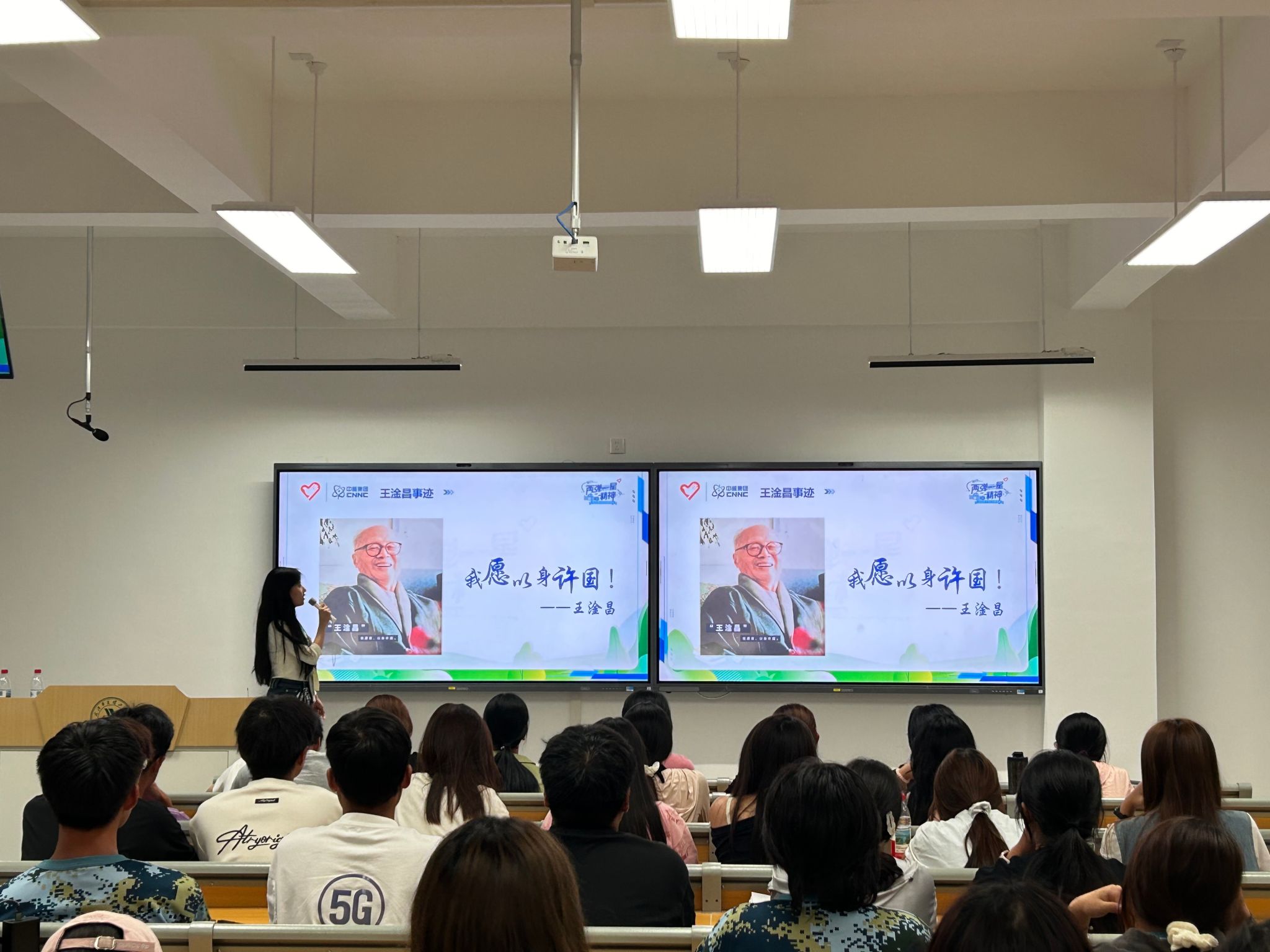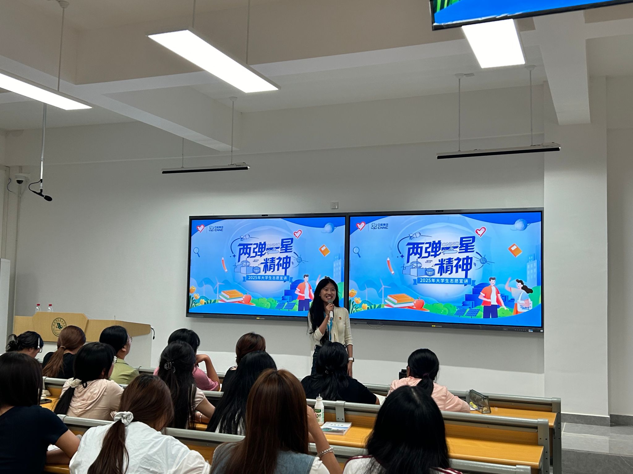 为将红色精神传承与新生入学教育深度融合,引导2025级新生在入学之初厚植家国情怀、树立远大理想,9月28日下午4点,商学院党员服务站“红星经纬”志愿宣讲团于梧桐湖校区B310教室,为工商管理专业新生带来“两弹一星”精神主题宣讲,本次宣讲由周雨凡同志主讲。