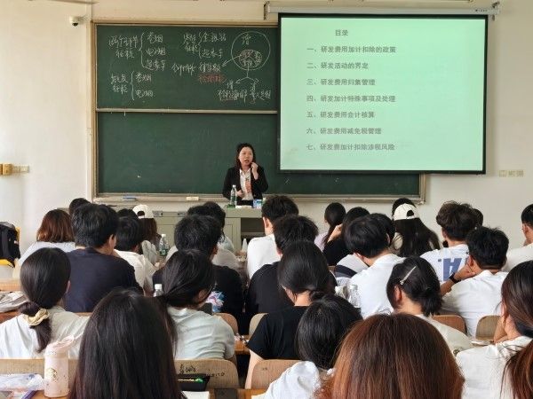 通专融合赋能会计人才。《税法》作为会计专业的核心课程,与管理学、经济学等多学科知识紧密相连。黄总监不仅从税法专业角度剖析研发费用加计扣除政策,还融入企业战略管理、财务管理等多方面内容。她指出研发费用加计扣除政策不仅是税务处理的环节,更是企业优化资源配置、提升竞争力的重要工具。研发费用加计扣除政策的落实,关乎国家创新驱动发展战略的推进,每一位财会人员都应秉持诚信、严谨的职业操守,依法依规进行税务申报。这不仅让学生们感受到职业的使命感与责任感,更引导他们树立正确的价值观和职业道德观,为未来走向工作岗位奠定了坚实的思想基础。