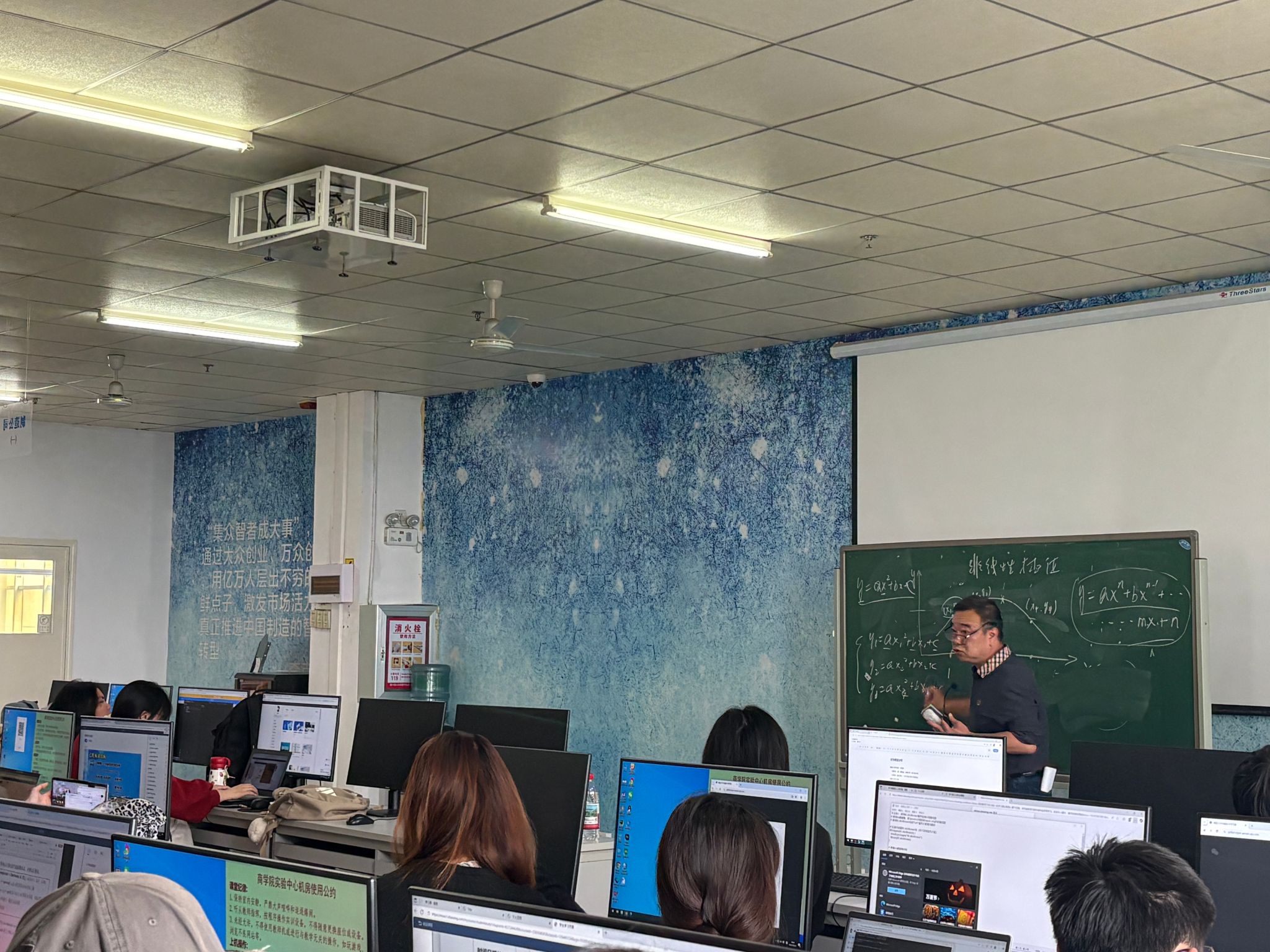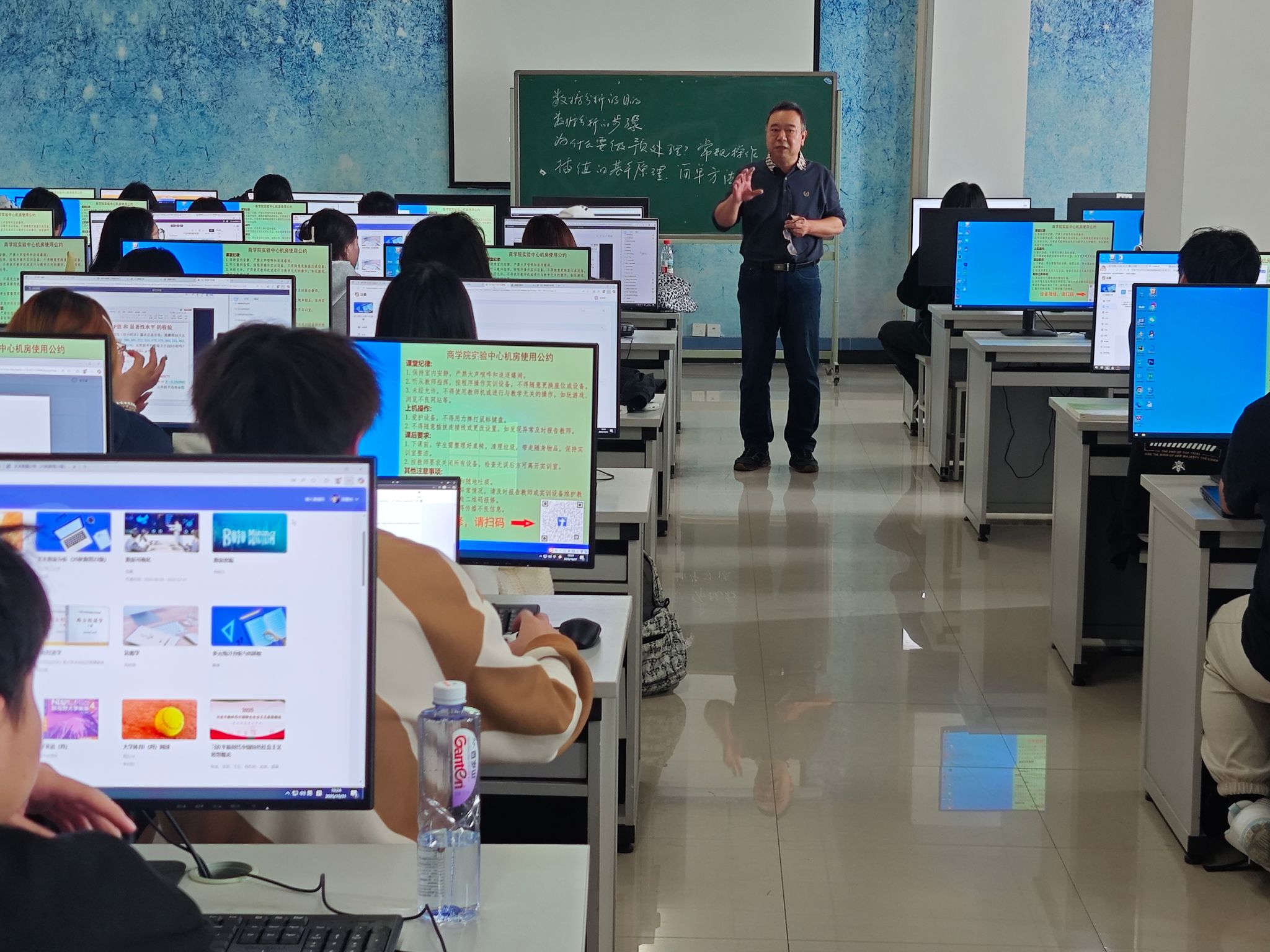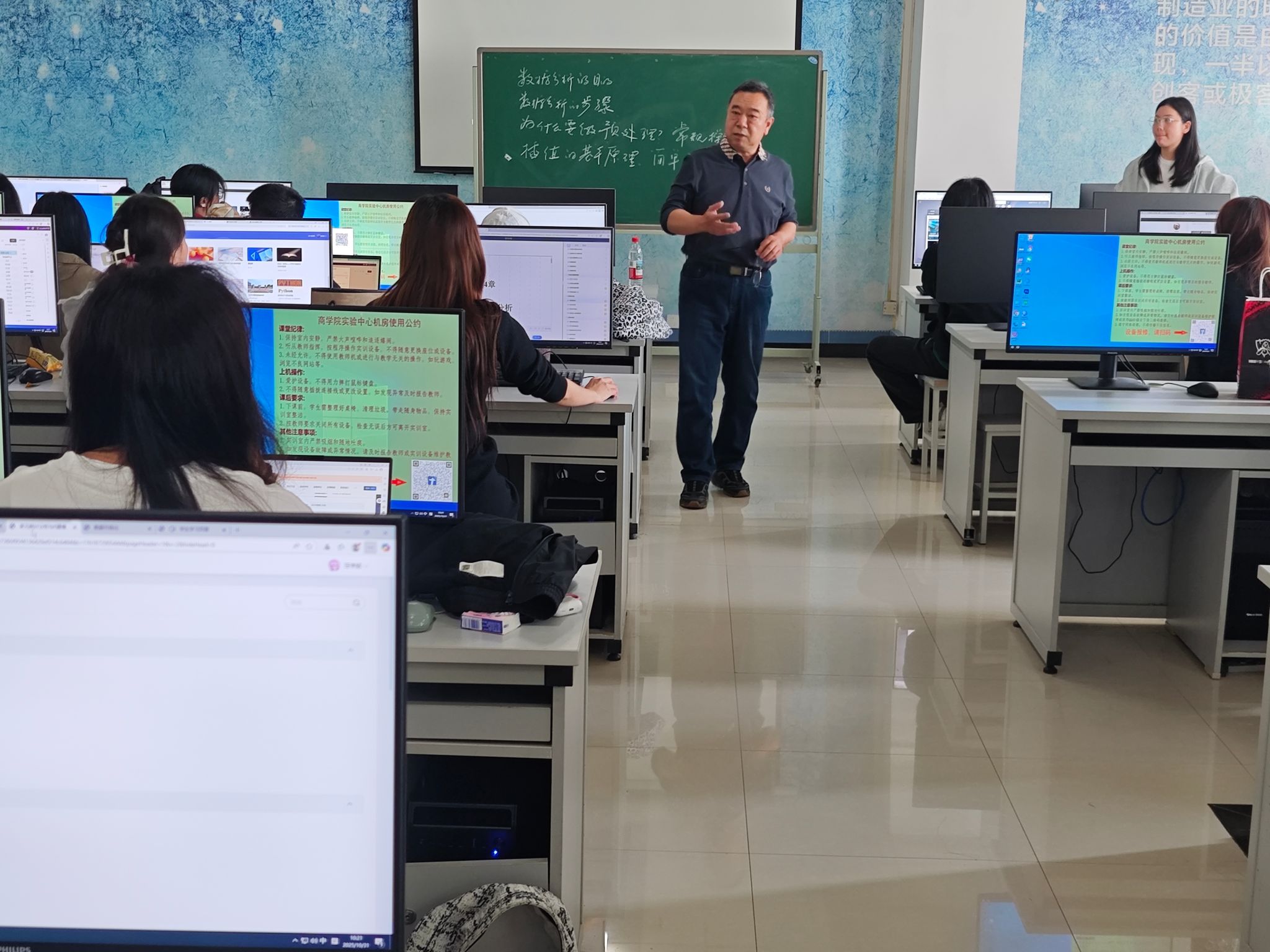 2025年10月31日上午,实验中心510教室内,大数据与电商系《行为数据分析》实验课如期进行。鉴于该课程聚焦行业前沿的行为数据采集、处理与建模技术,且全程以实操实验为核心载体,对教师的“前沿理论储备+精细化实验指导”能力提出双重高要求,特由信息管理与信息系统专业背景、深耕数据领域多年的王虎责任教授牵头,携手青年教师邢晓文共同授课,为大数据管理1231班、1232班学生提供专业指导。此次“双师共教”模式,既是为匹配纯实验课“理论讲解-实验演示-实时答疑”的全流程教学需求——王虎教授负责拆解前沿技术原理与核心实验逻辑,邢晓文老师辅助跟进学生实操进度、解决即时问题;也是通过“传帮带”机制,让青年教师在前沿实验课程教学中积累经验,最终实现课程质量与教师成长的双向赋能。