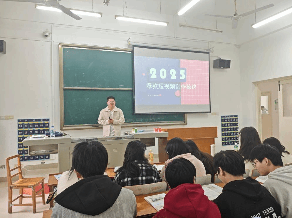 为深化产教融合、推动校企协同育人,近日,新媒体文案创意与策划课程迎来重磅企业导师。武汉索象云科技公司负责人、武汉紫善传媒有限公司合伙人曹小刚经理受邀走进工商1231班《新媒体文案创意与策划》课堂,以“爆款短视频创作秘诀”为主题开展专题授课,为学生带来一场兼具理论深度与实战经验的精彩讲座。