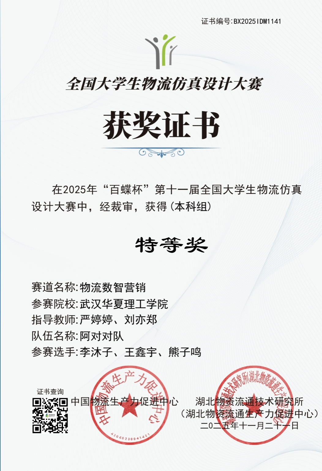 近日,2025年“百蝶杯”第十一届全国大学生物流仿真设计大赛结果揭晓,我院物流管理专业学生组成的“阿对对队”(成员:李沐子、王鑫宇、熊子鸣)在“物流数智营销”赛道中表现卓越,荣获全国总决赛特等奖,展现了学校在物流管理专业人才培养与数智化教学改革方面的显著成效。