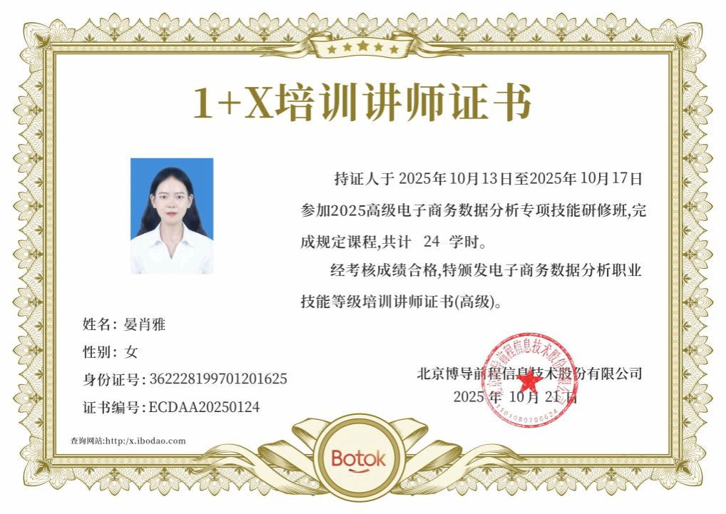 在数字化转型浪潮席卷全球的今天,电子商务领域对数据驱动的精细化运营能力提出了更高要求。为提升专业师资的数据分析与应用能力,晏肖雅老师于今年十月参加了由博导电商学院举办的“电子商务数据分析(高级)专项技能研修班”。此次为期数日的线上研修课程内容系统、注重实战,助力晏老师深化电商数据化认知,掌握将数据转化为商业洞察与行动策略的核心能力。