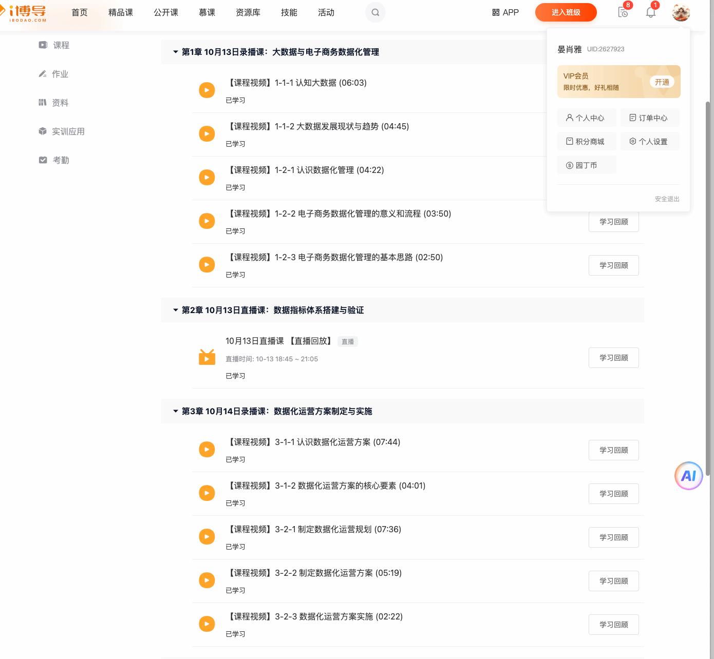 课程伊始,第一章《大数据与电子商务数据化管理》通过录播形式奠定了理论基础,明确了数据在电商生态中的核心价值。紧随其后的直播课《数据指标体系搭建与验证》则迅速切入实战,讲师深入讲解了如何从海量数据中筛选关键指标,构建真实反映业务健康度的数据模型。后续课程逐步引导学员从宏观规划深入到微观执行与效果追踪,特别是《业务数据综合分析认知与数据分析模型认知》等章节,显著提升了晏老师对数据背后商业逻辑的解读能力,使其能透过数字洞察用户行为、市场趋势与运营瓶颈。