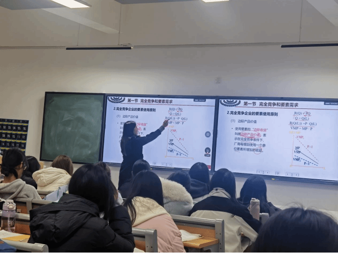 课堂上,袁慧老师展现出娴熟的课程驾驭能力。授课过程流畅自然,对“生产要素市场”相关理论知识讲解清晰透彻,同时巧妙融入小问题、计算题及实践小案例,通过师生互动调动课堂氛围,引导学生将理论知识与实际应用相结合,有效提升了学生的参与度和学习积极性。整堂课教学环节设计合理,逻辑清晰,充分体现了其前期充分的教学准备和扎实的专业基础。