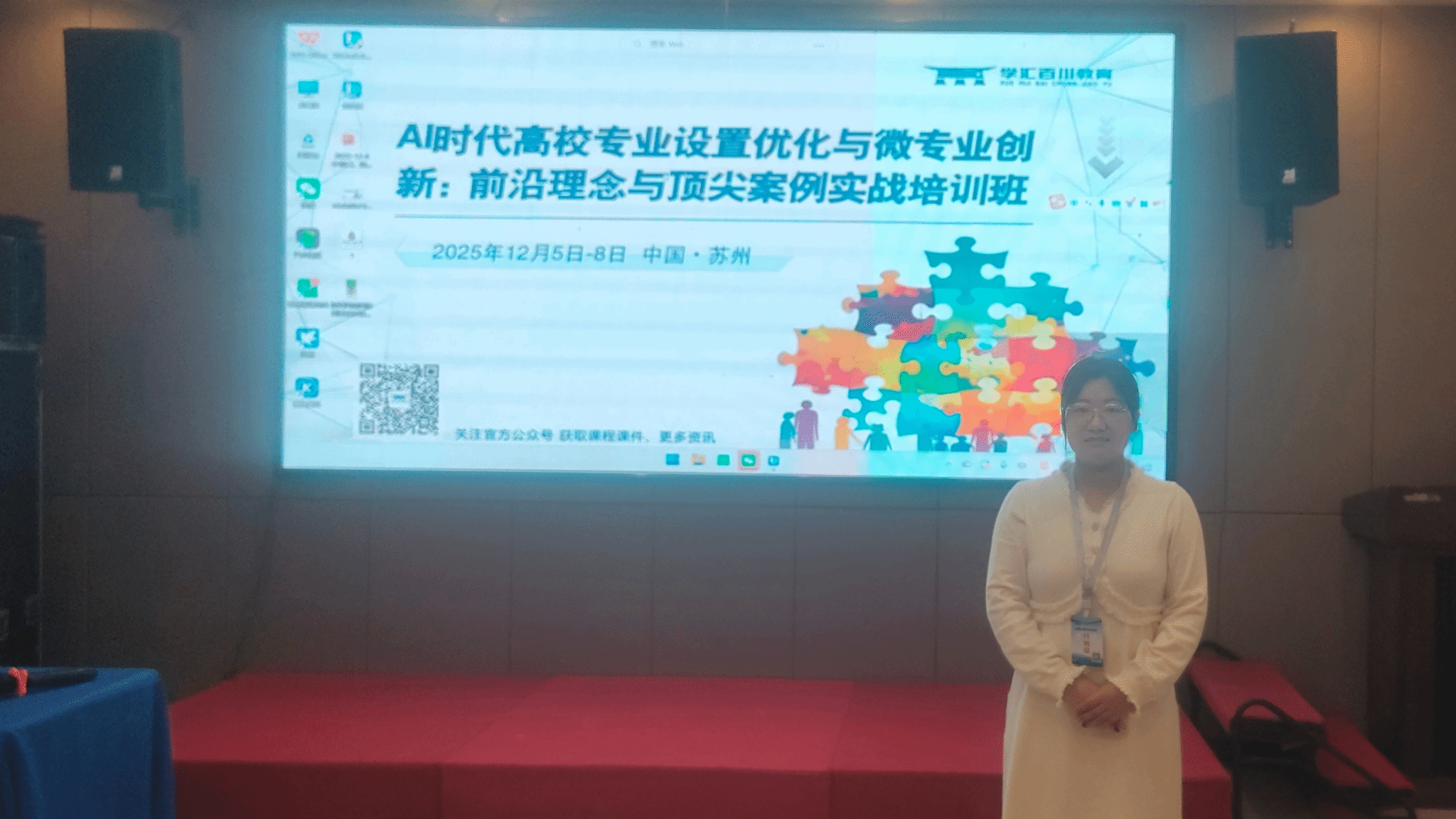 为积极响应教育部“双千”计划号召,了解AI时代电子商务专业建设与教学改革趋势,2025年12月5日至8日,我院大数据与电商系教师刘颖颖赴苏州参加了由北京国育中培教育科技院主办的“AI时代高校专业设置优化与微专业创新:前沿理念与顶尖案例实战培训班”。本次培训紧密围绕“人工智能+教育”融合发展趋势,从政策解读、理论建构、方法设计到案例实践,全方位解析微专业建设的逻辑与路径。