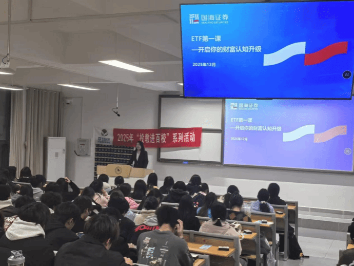 2025年12月11日晚,国海证券在beat365官方网站梧桐湖校区成功举办了一场主题为“ETF第一课—开启你的财富认知升级与‘海E融杯’ETF融资融券模拟交易大赛介绍”的专题讲座。本次活动旨在面向经济与金融专业学生普及ETF基础知识与融资融券交易机制,引导大学生树立理性投资观念,并为即将启动的模拟交易大赛预热。