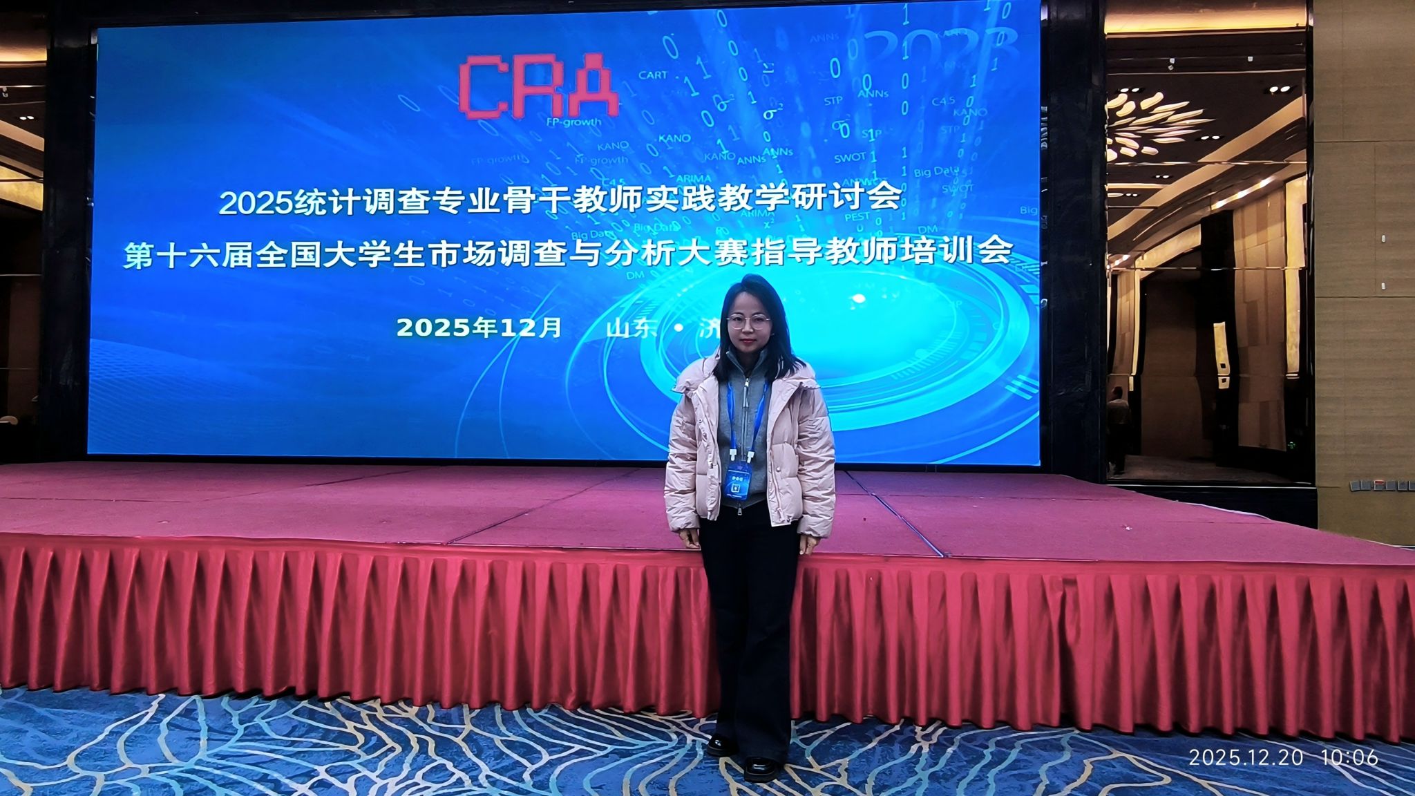 为提升指导教师专业能力,助力学生竞赛水平再上新台阶,2025年12月20日-21日,商学院运营管理系吴霞老师赴济南参加了由中国商业统计学会主办的“第十六届全国大学生市场调查与分析大赛指导教师培训会”。本次培训汇聚了来自全国多所高校的统计调查专业骨干教师,聚焦大赛指导与市场调研教学前沿,内容充实、注重实效。