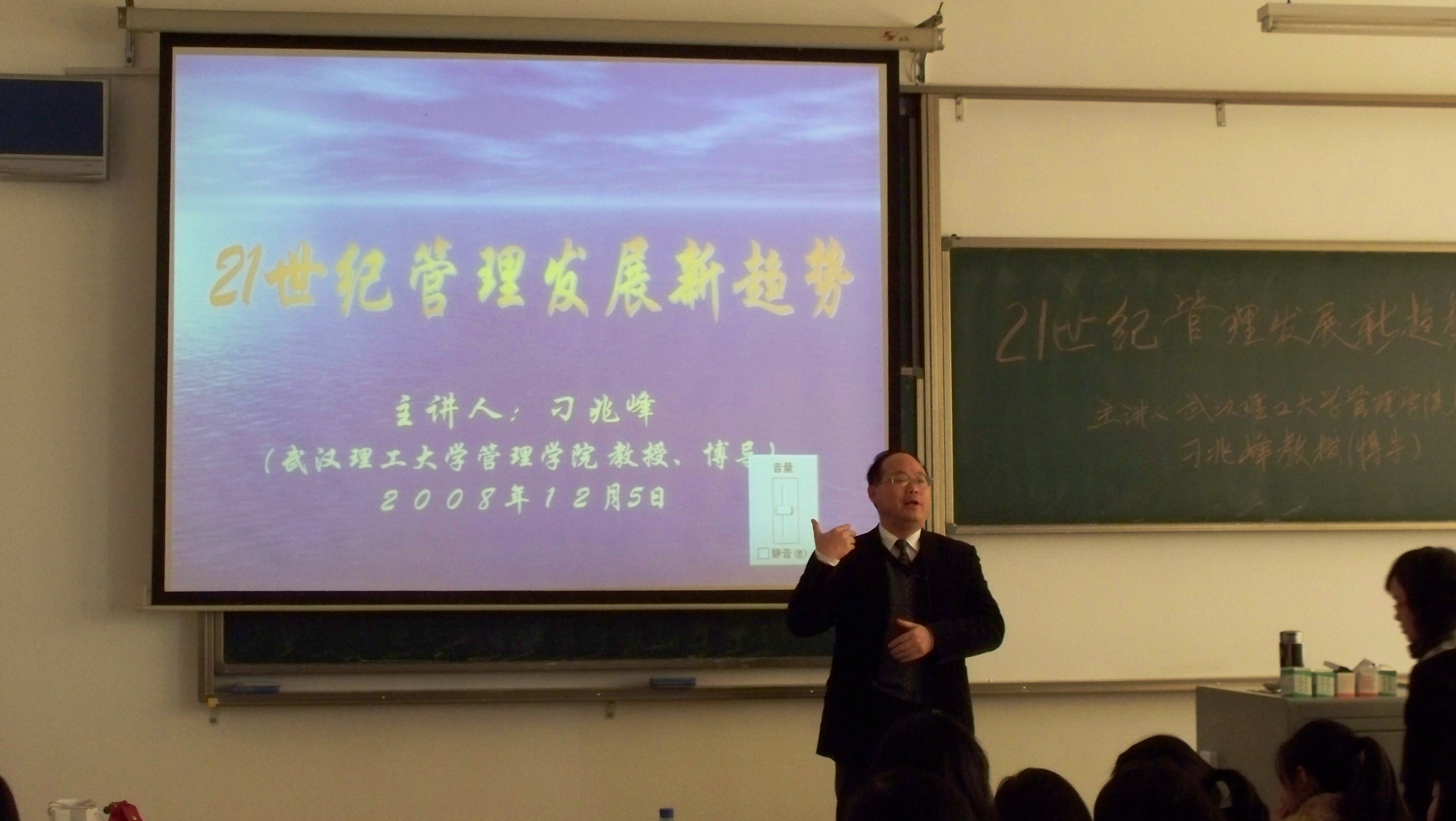 12月5日,经管系工商管理教研室特邀武汉理工大学管理学院副院长——刁兆峰教授,于下午2点在武汉理工大学华夏学院2教307为2008届经管系所有学生,做了一次题为“21世纪管理发展新趋势”的专题讲座。刁兆峰教授多年从事管理科学与工程和工商企业管理方面的教学和科研工作,先后承担国家级及省部级软科学研究课题10余项,多次获省级奖项,并担任多家企事业单位的常务理事和战略咨询专家,对管理学界的新思维、新理念有全面的把握和深入的了解。