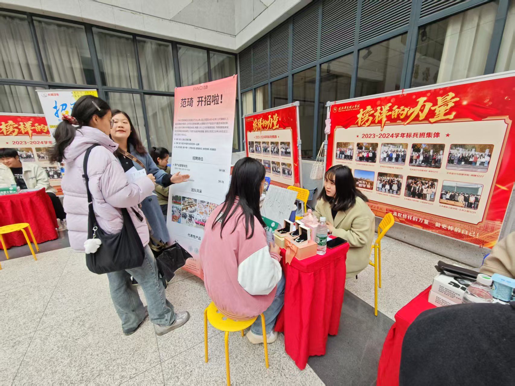 各企业展位前整齐摆放着岗位需求手册,部分企业的特色展示吸引众多学生驻足。毕业生们手持精心制作的简历,与企业HR就职业发展、薪酬待遇等问题展开深入交流。有的同学对营销岗位充满兴趣,在上海热风时尚企业发展集团有限公司的展位前,详细询问企业的业务范围、市场布局,招聘人员耐心地解答。而有的同学则钟情于互联网行业,在湖北亿玛科技有限公司的展位前,与招聘人员深入交流了自己在数据分析、运营方面的项目经验。商学院应届生侯博表示:"这次招聘会岗位专业匹配度高,既有世界500强企业,也有快速成长的科创企业,为我们提供了多元选择。"