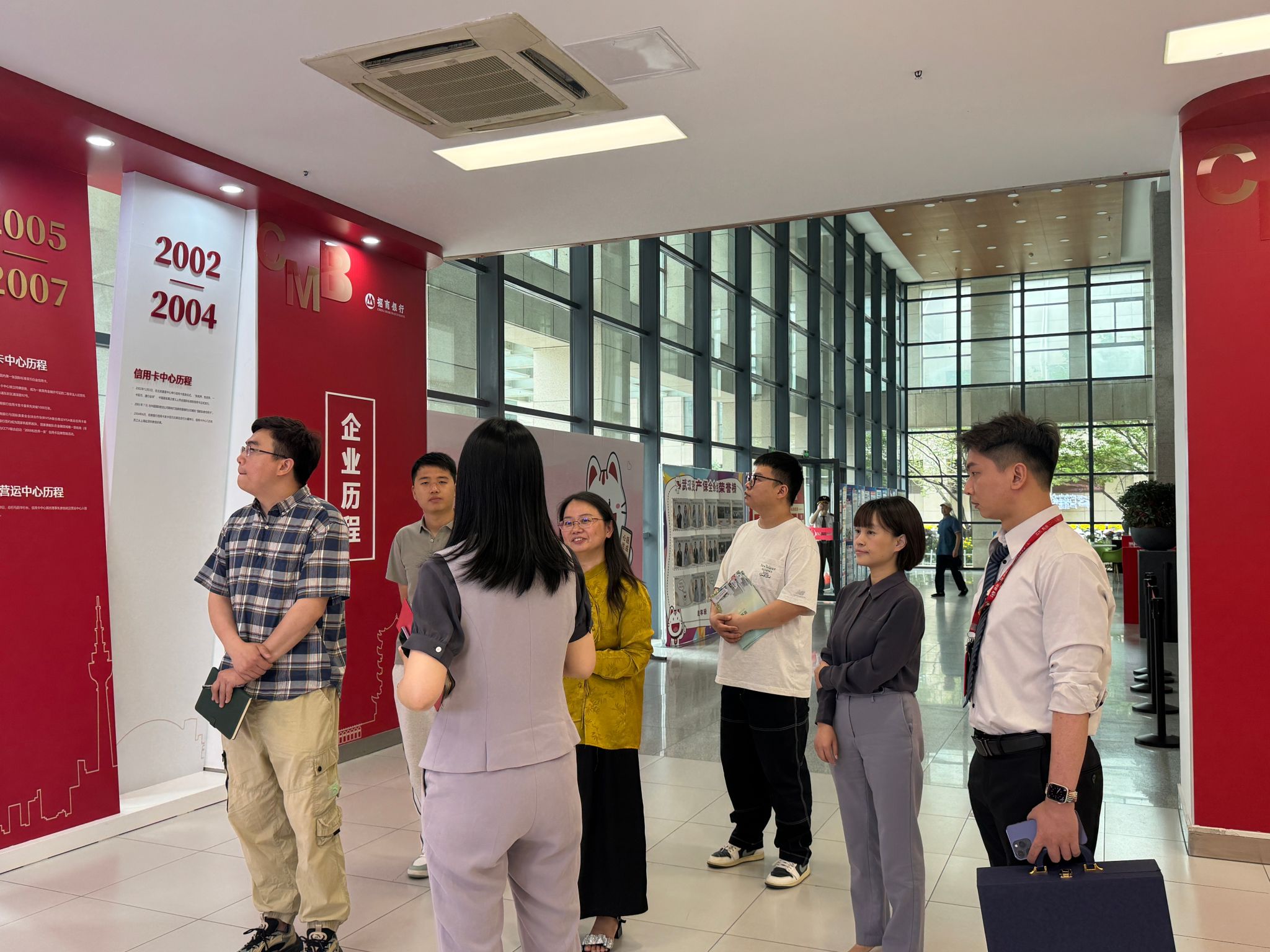 在汤经理的陪同下,商学院一行首先参观了招商银行信用卡中心武汉分中心的文化墙及办公环境,深入了解企业发展历程、业务布局及员工培养体系。赵雪萍介绍,招商银行信用卡中心始终注重员工职业成长,为应届毕业生提供完善的培训体系和广阔的发展空间。