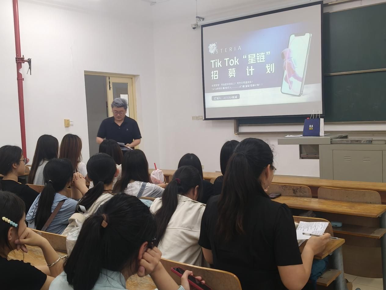 活动伊始,星链计划企业团队代表对同学们的到来表示热烈欢迎,并简要阐述了本次讲座的目的和主要内容。随后,团队成员从多个维度对TikTok的发展现状与未来趋势进行了全面剖析。在国际现状方面,主讲人通过详实的数据和生动的案例,展示了TikTok在全球市场的迅猛发展态势,以及其在不同国家和地区的用户规模、市场份额和文化影响力。同时,深入分析了当前TikTok在国际市场上面临的机遇与挑战。关于发展趋势,主讲人结合行业动态和技术发展方向,对TikTok未来的内容创作、商业模式、技术应用等方面进行了前瞻性的预测,为同学们勾勒出一幅清晰的行业发展蓝图。针对同学们关心的职业发展问题,主讲人详细介绍了TikTok主播和经纪人的岗位要求、职业发展路径以及所需具备的核心能力和素质。此外,还分享了多个优秀案例,通过分析这些成功案例的运营策略和经验,为同学们提供了宝贵的借鉴。在互动环节,同学们积极提问,就TikTok的运营技巧、内容创新、职业规划等问题与企业团队进行了深入交流。企业团队成员耐心解答,现场氛围热烈而融洽。