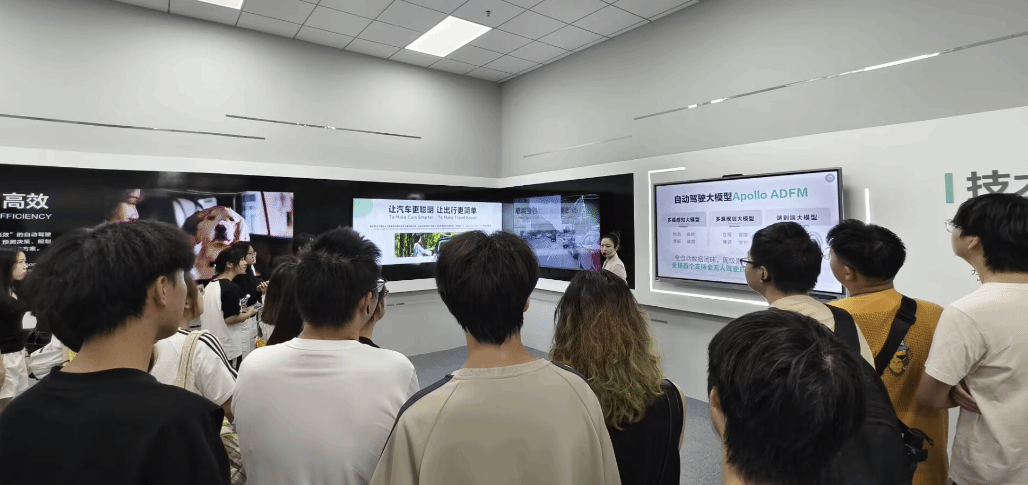 作为国内领先的智能网联汽车示范基地,在智行谷展厅,师生们通过企业专业人员讲解,了解了萝卜快跑如何依托大数据分析、高精度地图及人工智能算法实现无人驾驶的全程智能化管理。企业技术人员重点讲解了海量交通数据的采集、处理与应用全流程,并介绍了自动驾驶系统如何通过实时数据优化路径规划与决策。