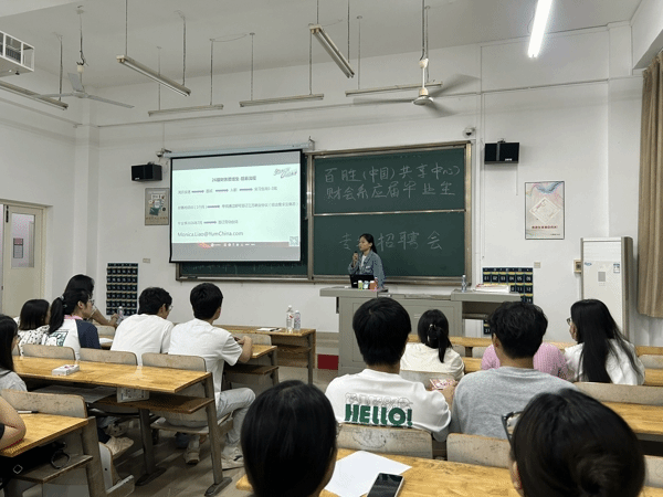 在同学们对百胜有了充分认识后,廖经理将重点转向了大家最为关心的实习与就业信息。她详细介绍了百胜为应届毕业生提供的实习生岗位,包括岗位的具体职责与要求;公开透明的实习生薪资标准,让同学们对自身劳动价值有了清晰认知;还深入讲解了实习生从实习到转正的完整流程,以及正式员工所能享受到的丰富福利待遇。此外,廖经理还着重介绍了公司完善的员工培训与发展体系,为应届毕业生在职业发展方向的选择上提供了全面且长远的参考,助力他们规划清晰的职业成长路径。