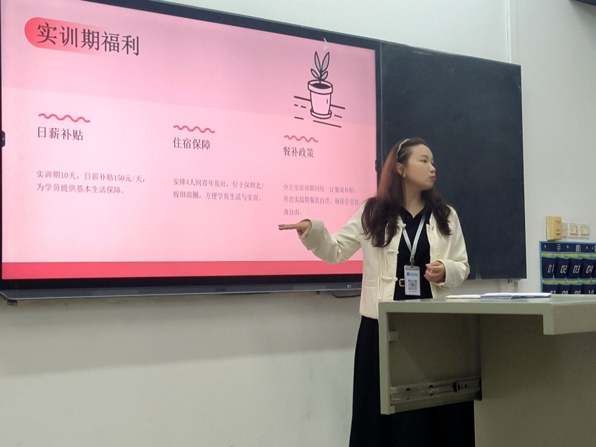 随后,她详细介绍了第二期计划的核心内容。项目将于10月中旬启动,为期10天封闭式实训,培训点设在深圳总部,打造“理论+实操+实战”三位一体培养模式。办公室内开展国际物流行业知识库专项培训,仓库现场进行全链路实操演练,还将组织“扫楼实战”,学员在导师指导下完成定量真实客户拜访,期间同步安排周六户外拓展团建,助力学员快速融入团队。