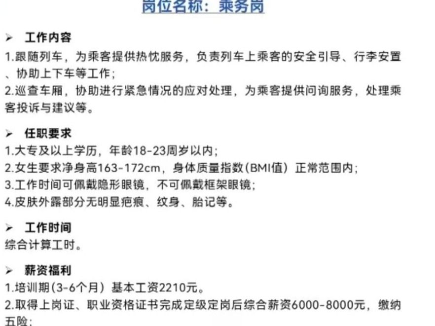 在岗位职责与报名条件方面,王老师明确,该岗位需负责乘客安全引导、行李看护,协助上下车安全指引,并在紧急情况时协助乘客、接收建议与投诉,核心聚焦乘客出行安全与服务体验。报名需满足大专及以上学历、18-24周岁(特殊情况可放宽至25周岁)的基础条件,同时对形象与安全有具体要求:女生净身高不低于163cm且体重在正常BMI范围,工作期间须佩戴隐形眼镜,面部及暴露皮肤无明显疤痕、文身。