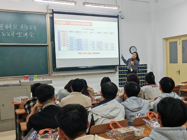 宣讲会伊始,企业代表聚焦企业“三位一体”的核心竞争力,为同学们详细介绍了斗半匠科技“省重点文化企业”的硬核数据、分享了“如果我是孩子,如果孩子是我”研发理念以及“斗”(奋斗)、“半”(空杯)、“匠”(极致)的品牌文化。